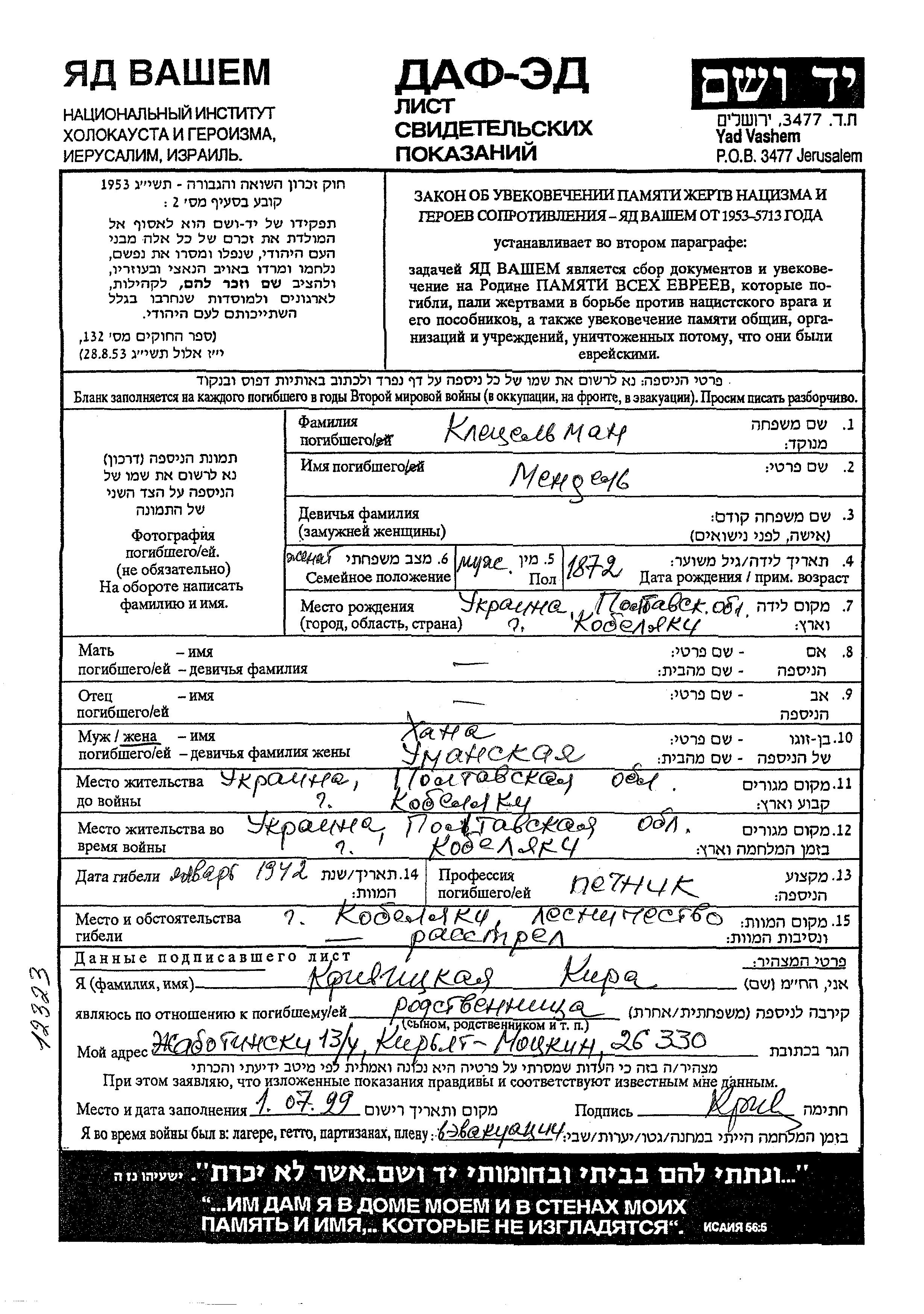 Mendel Kletzelman wurde im Jahr 1872 in Kobelyaki, Ukraine (UdSSR) geboren. Er war Ofensetzer und -reparateur und mit Khana Verheiratet. Vor dem Zweiten Weltkrieg lebte er in Kobelyaki, Ukraine (UdSSR). Während des Krieges war er in Kobelyaki, Ukraine (UdSSR).