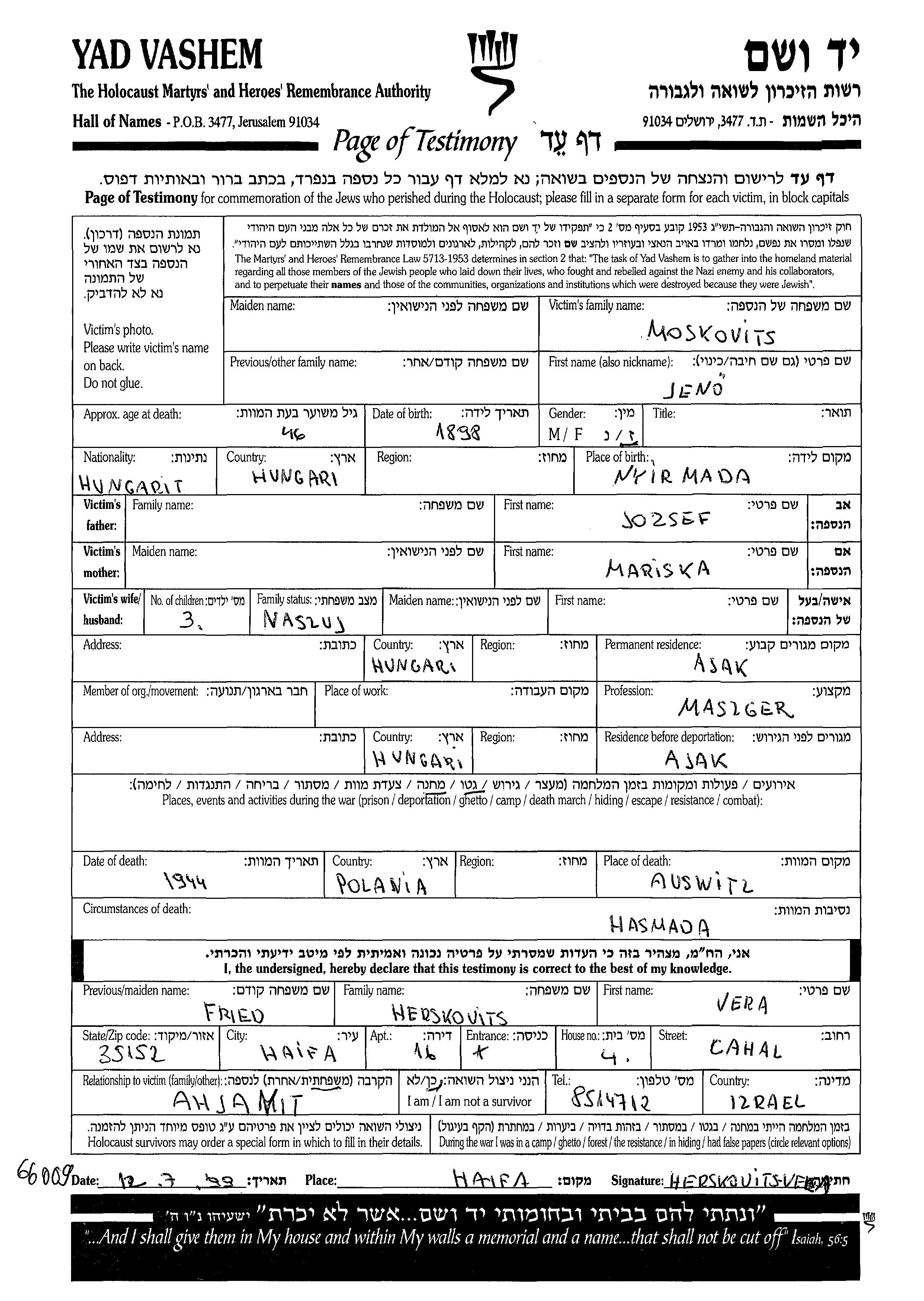 Jeno Moskovits wurde im Jahr 1898 in Nyirmada, Ungarn geboren. Er war der Sohn von Jozsef und Mariska. Er war Schlosser und Verheiratet. Vor dem Zweiten Weltkrieg lebte er in Ajak, Ungarn. Während des Krieges war er in Ajak, Ungarn.