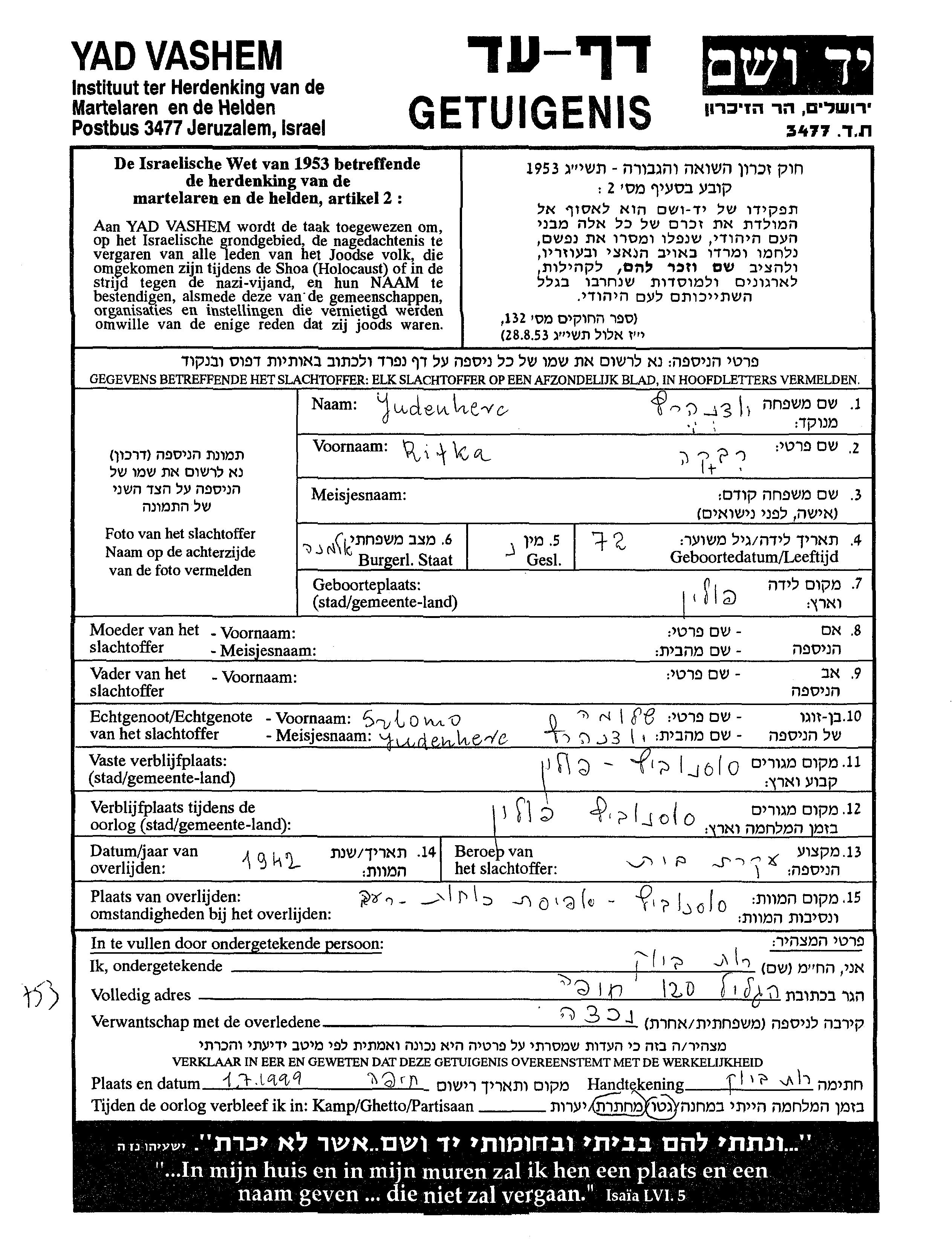 Rivka wurde in der Schoah ermordet. Todesort: Sosnowic, Polen im Jahr 1942.