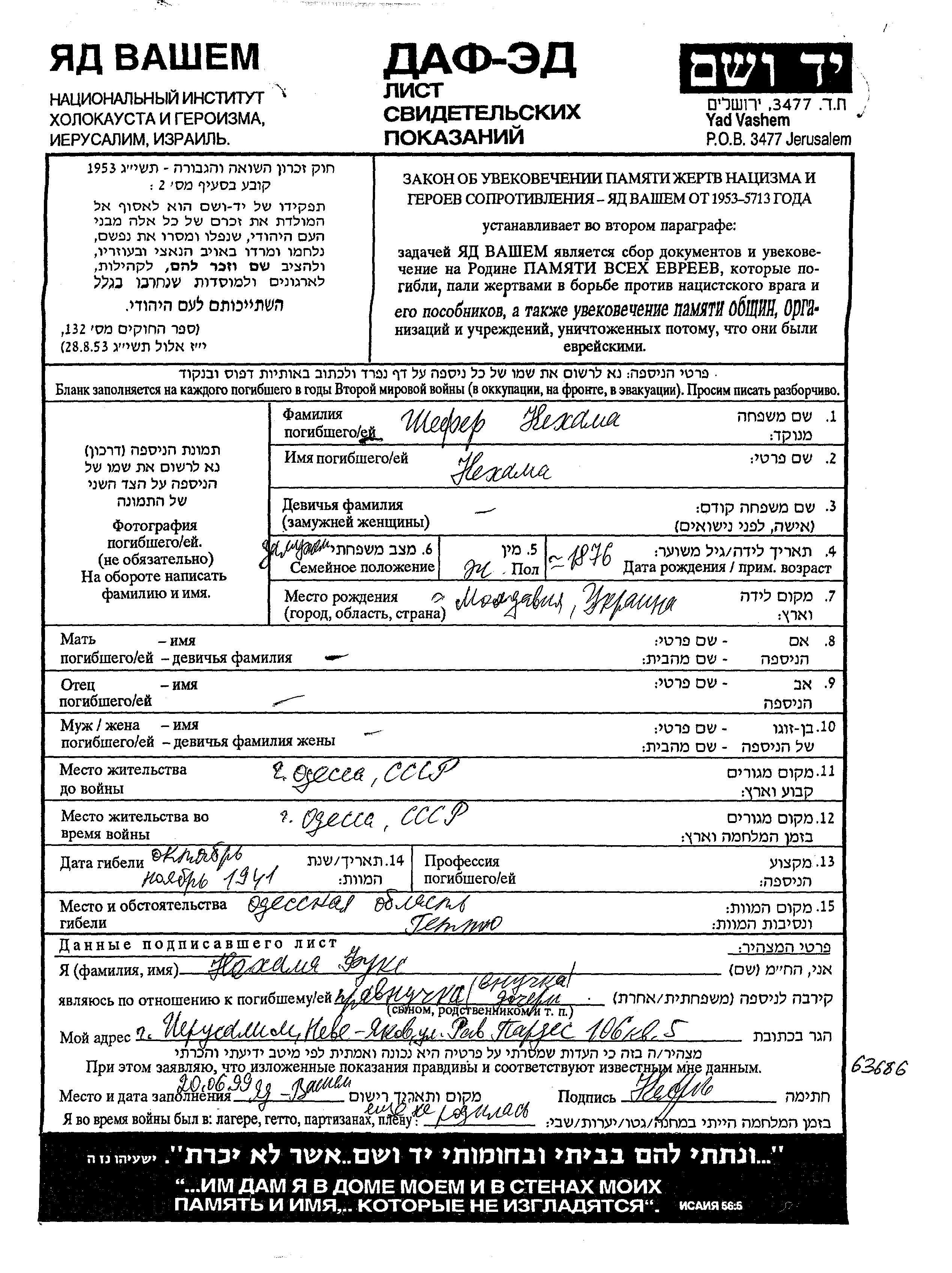 Nekhama Shefer wurde im Jahr 1876 in Moldavia, Rumänien geboren. Sie war Verheiratet. Vor dem Zweiten Weltkrieg lebte sie in Odessa, Ukraine (UdSSR). Während des Krieges war sie in Odessa, Ukraine (UdSSR).