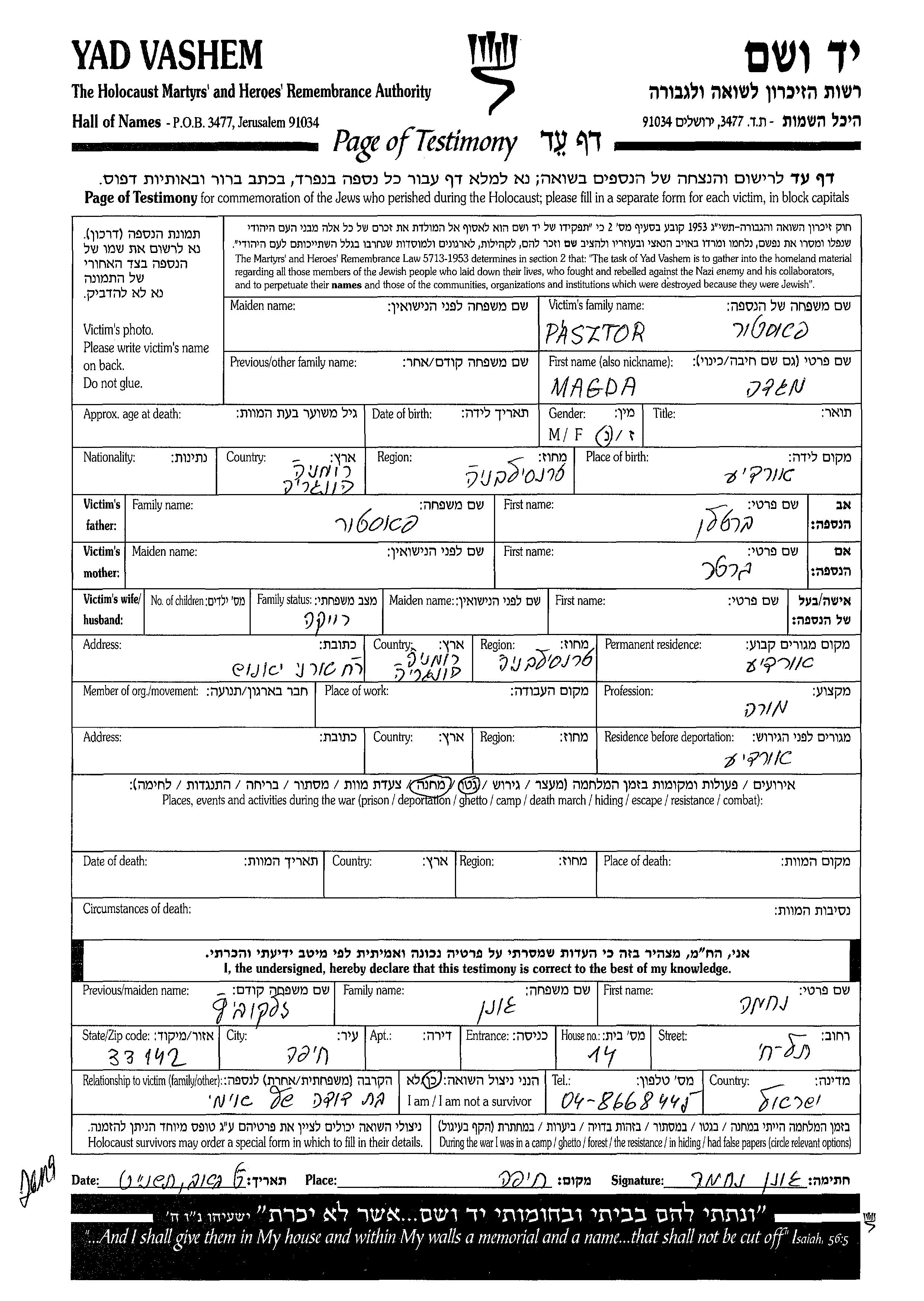 Magda Pasztor wurde in Oradea, Rumänien geboren. Sie war die Tochter von Bertalan und Berta. Sie war Lehrer/in und Ledig. Vor dem Zweiten Weltkrieg lebte sie in Oradea, Rumänien. Während des Krieges war sie in Oradea, Rumänien.