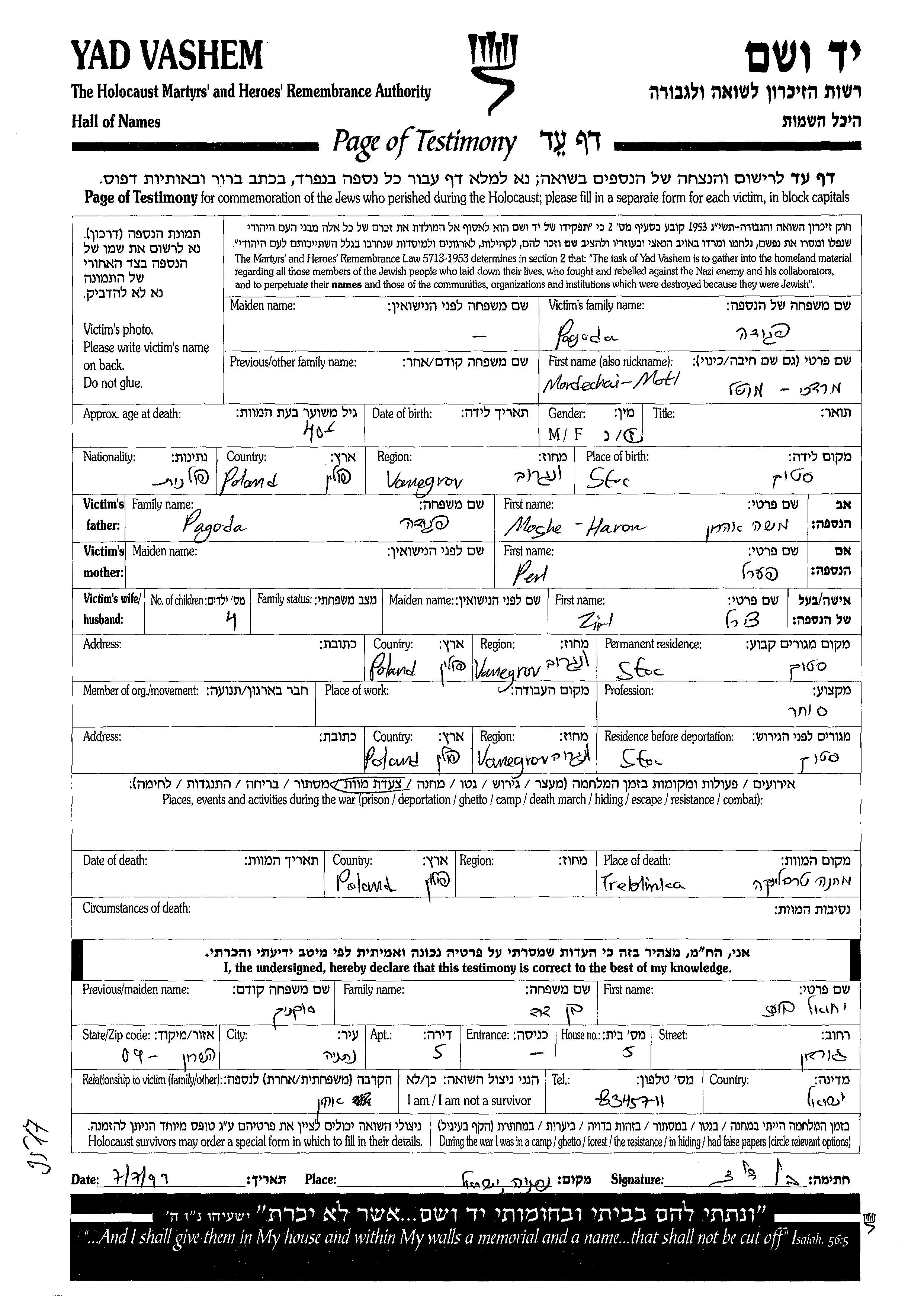Mordechai Pagoda wurde in Stok, Polen geboren. Er war der Sohn von Moshe Haron und Perl. Er war Kaufmann/-frau. Vor dem Zweiten Weltkrieg lebte er in Stok, Polen. Während des Krieges war er in Stok, Polen. Mordechai wurde in der Schoah ermordet. Todesort: Treblinka, Polen.