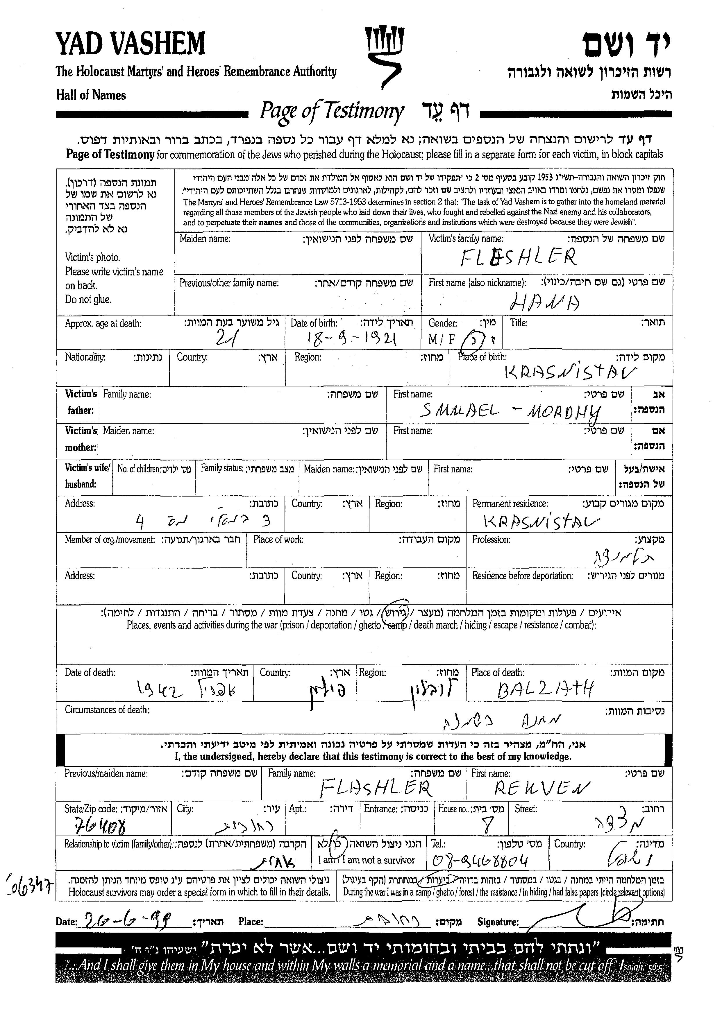Hana Fleshler wurde im Jahr 1921 in Krasnistav, Polen geboren. Sie war die Tochter von Smuel Mordhy und Brandel, geb. Hercberg. Sie war Schüler/-in. Vor dem Zweiten Weltkrieg lebte sie in Krasnistav, Polen.