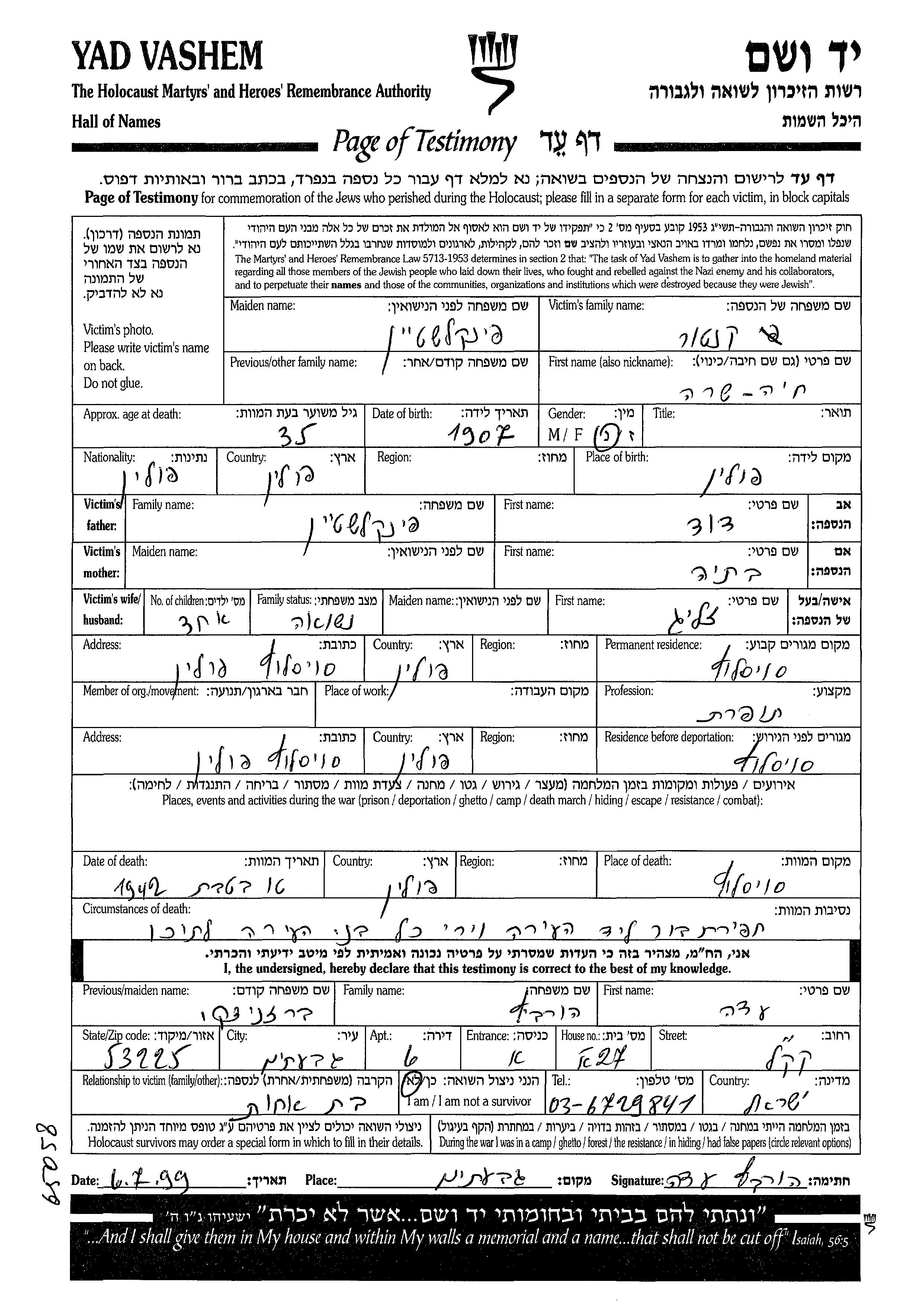 Khaia Sara Kantor, geb. Finkelshtein wurde im Jahr 1907 in Polen geboren. Sie war die Tochter von David und Batia. Sie war Schneiderin und mit Zelig Verheiratet. Vor dem Zweiten Weltkrieg lebte sie in Swislocz, Polen. Während des Krieges war sie in Swislocz, Polen.