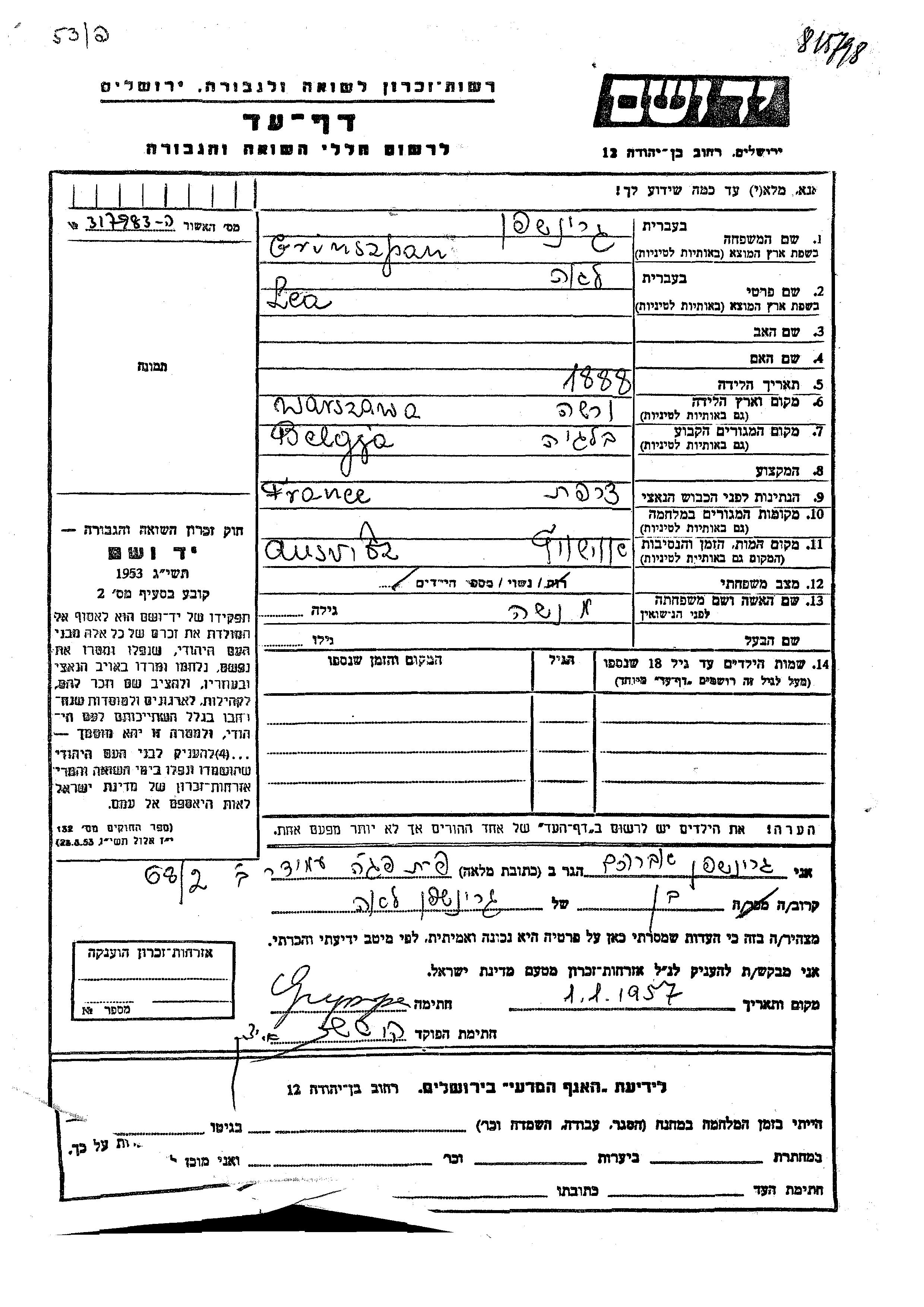 Lea wurde in der Schoah ermordet. Todesort: Auschwitz, Polen.