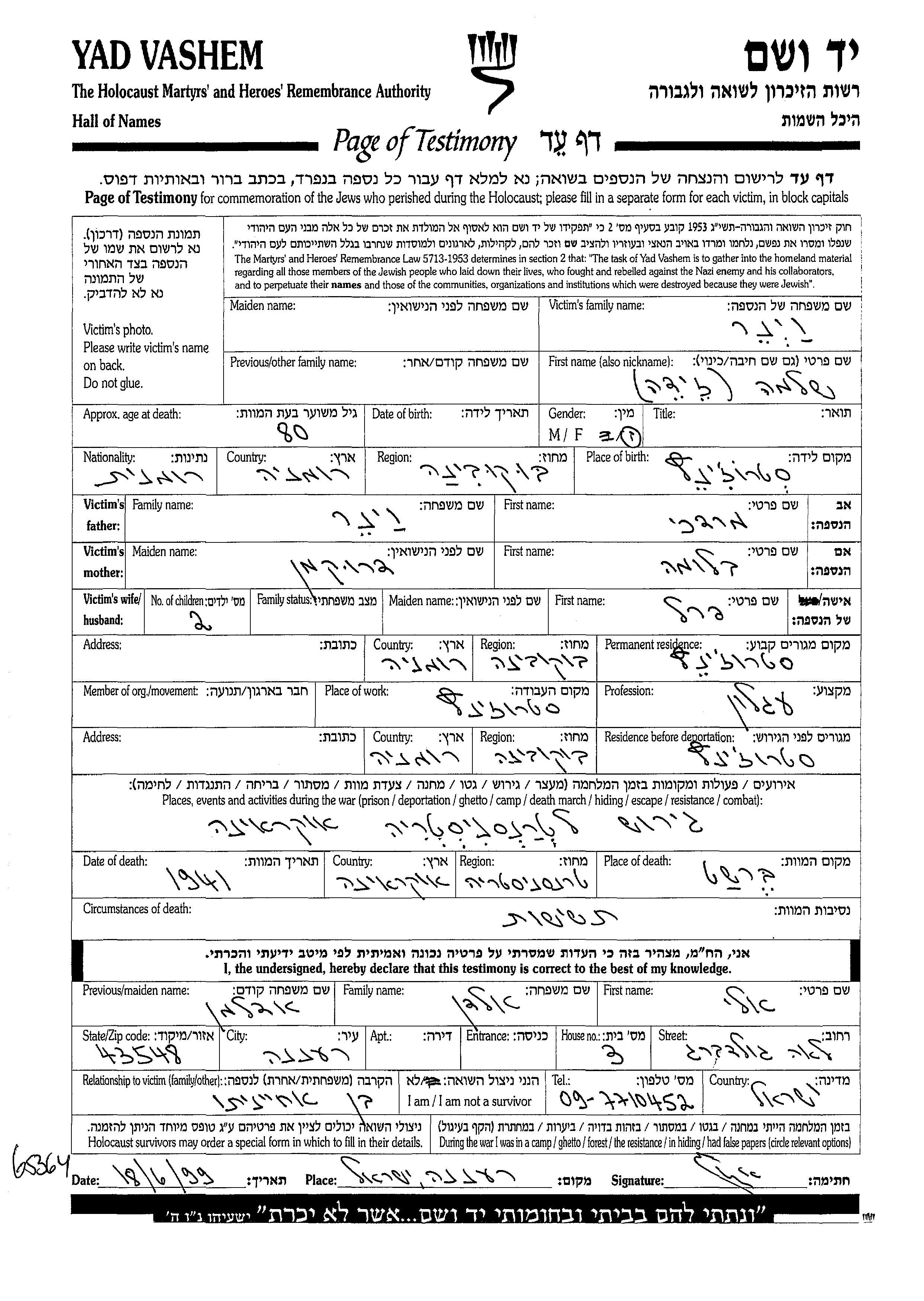 Shlomo Zeide wurde in der Schoah ermordet. Todesort: Bershad, Ukraine (UdSSR) im Jahr 1941.
