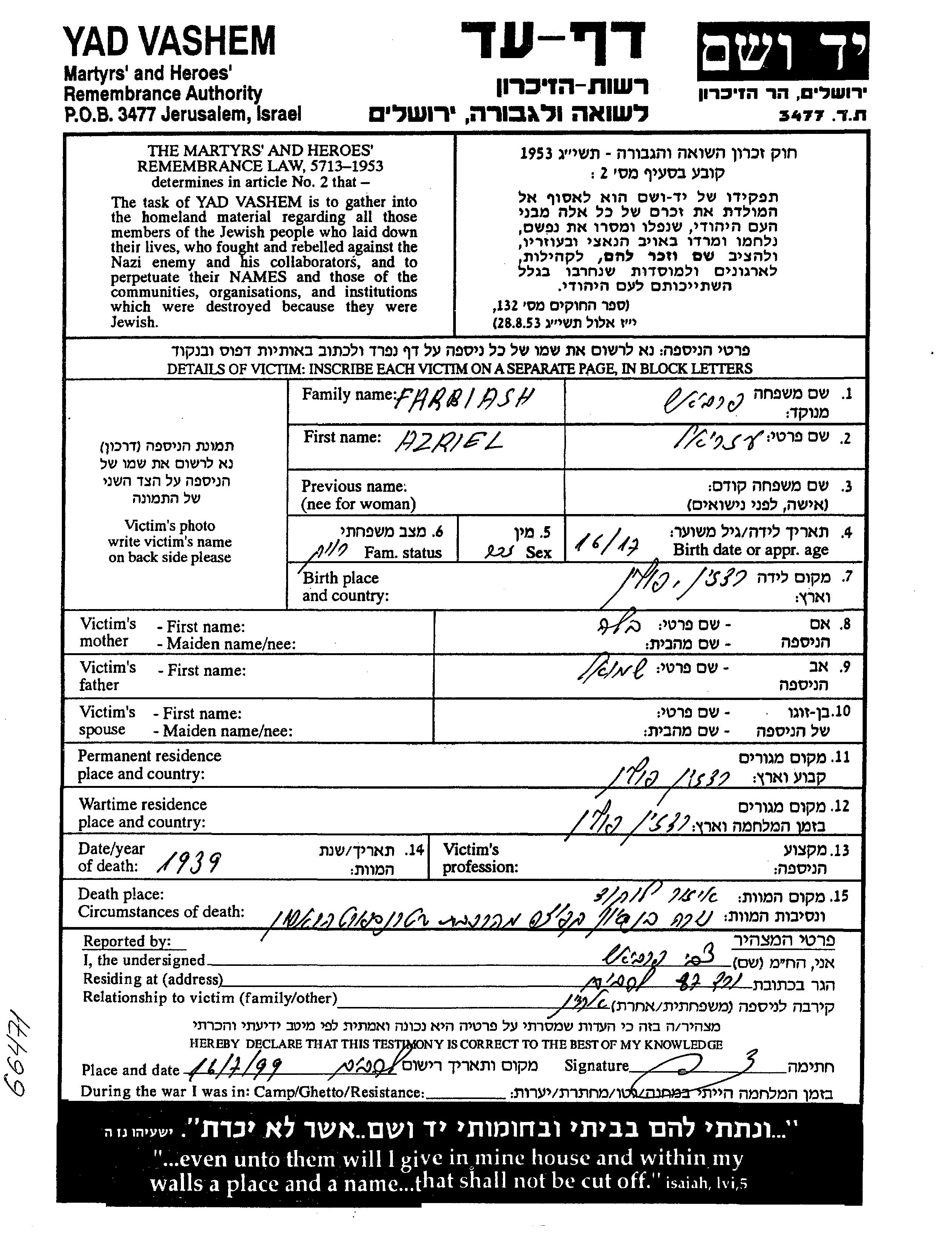 Azriel Farbiash wurde in Radzin, Polen geboren. Er war der Sohn von Shmuel und Bela. Er war Kind. Vor dem Zweiten Weltkrieg lebte er in Radzin, Polen. Während des Krieges war er in Radzin, Polen.