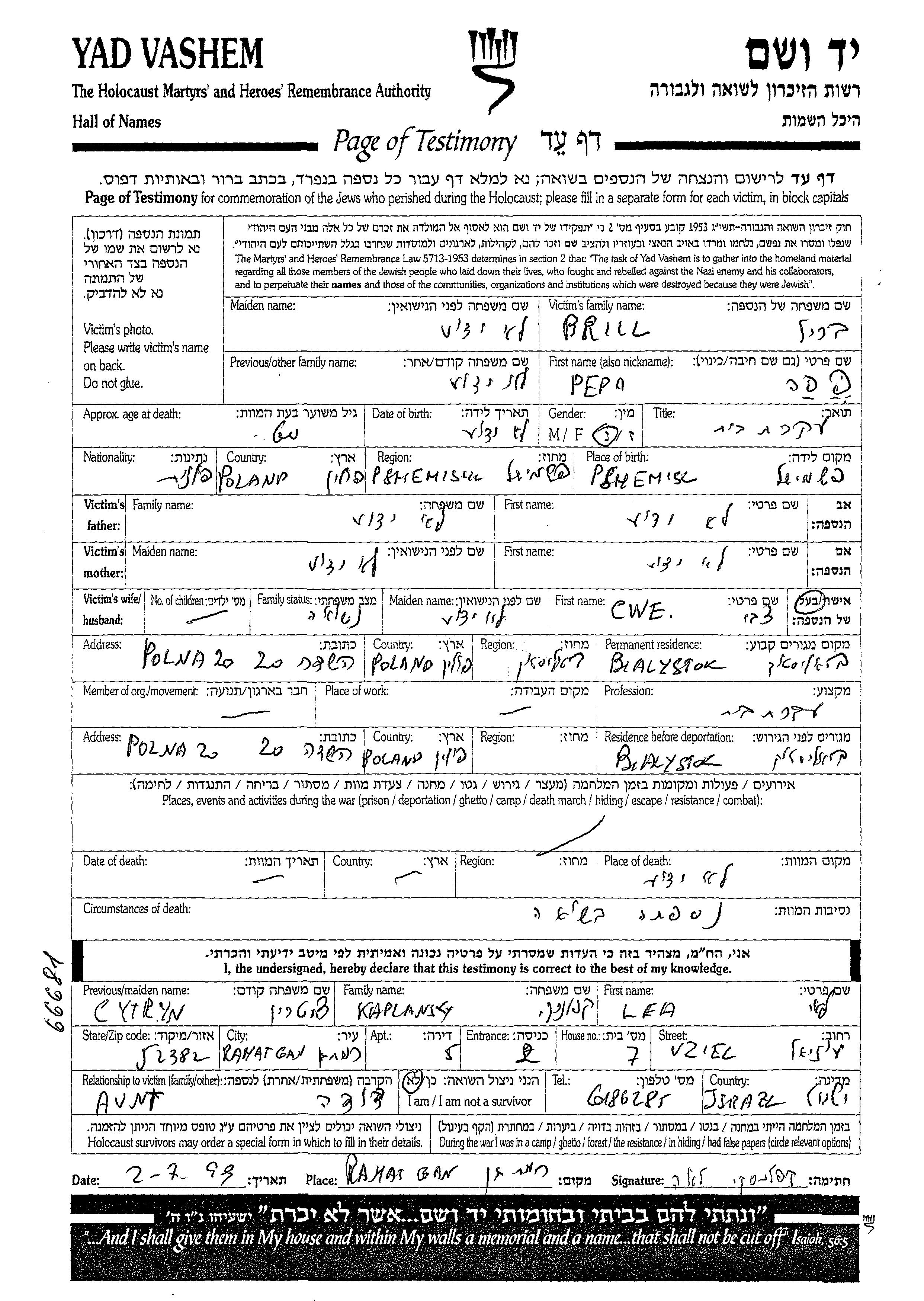 Pepa Brill wurde in Pszemysl, Polen geboren. Sie war Hausfrau und mit Cwe Verheiratet. Vor dem Zweiten Weltkrieg lebte sie in Bialystok, Polen. Während des Krieges war sie in Bialystok, Polen.