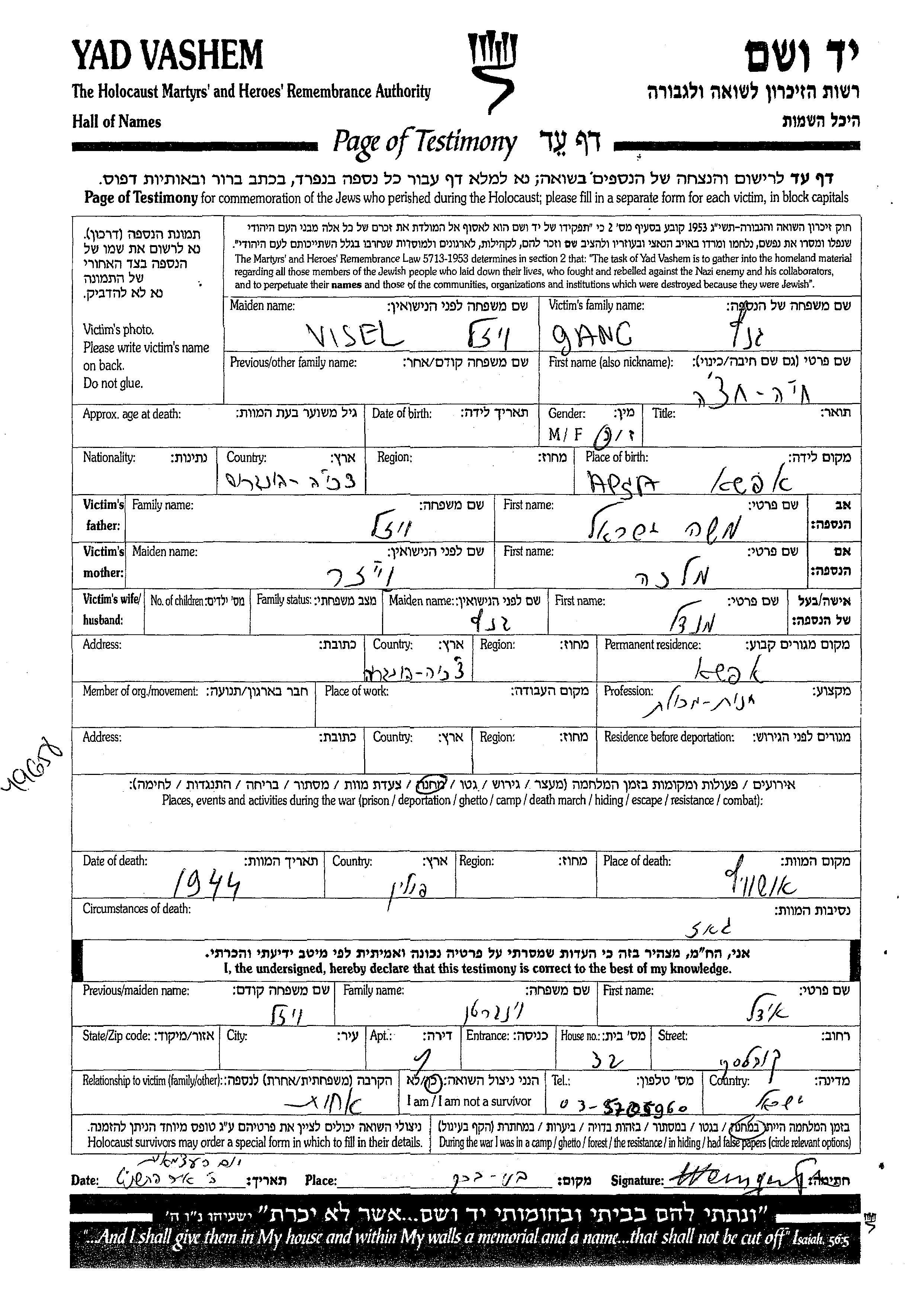 Khaia Khatza Ganc, geb. Visel Vizel wurde in Apsa, Tschechoslowakei geboren. Sie war die Tochter von Moshe Yisrael und Malka. Vor dem Zweiten Weltkrieg lebte sie in Apsa, Tschechoslowakei.