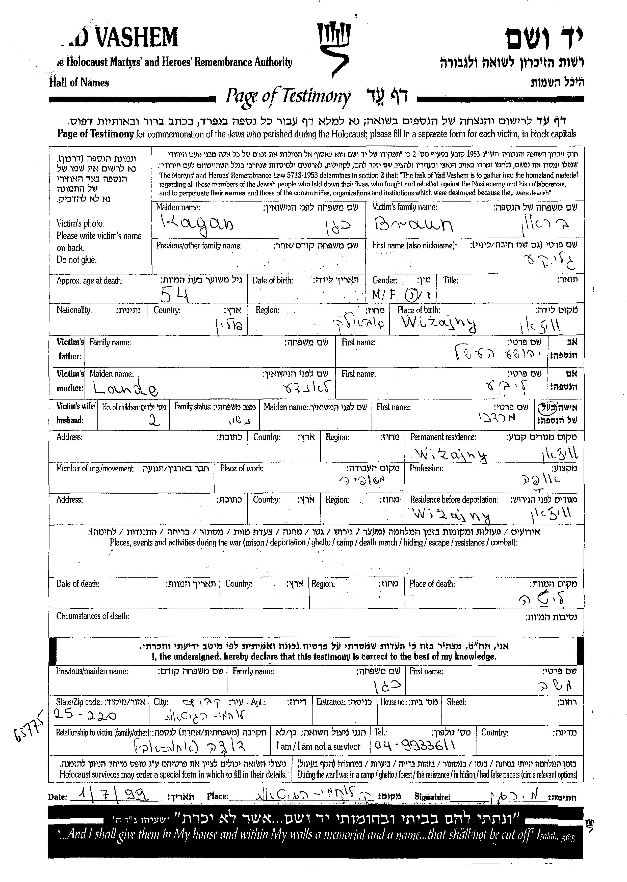 Glika Braun, geb. Kagan wurde in Wizajny, Polen geboren. Sie war die Tochter von Yehoshua und Libe. Sie war Bäcker/-in und mit Mordekhai Verheiratet. Vor dem Zweiten Weltkrieg lebte sie in Wizajny, Polen. Während des Krieges war sie in Wizajny, Polen.