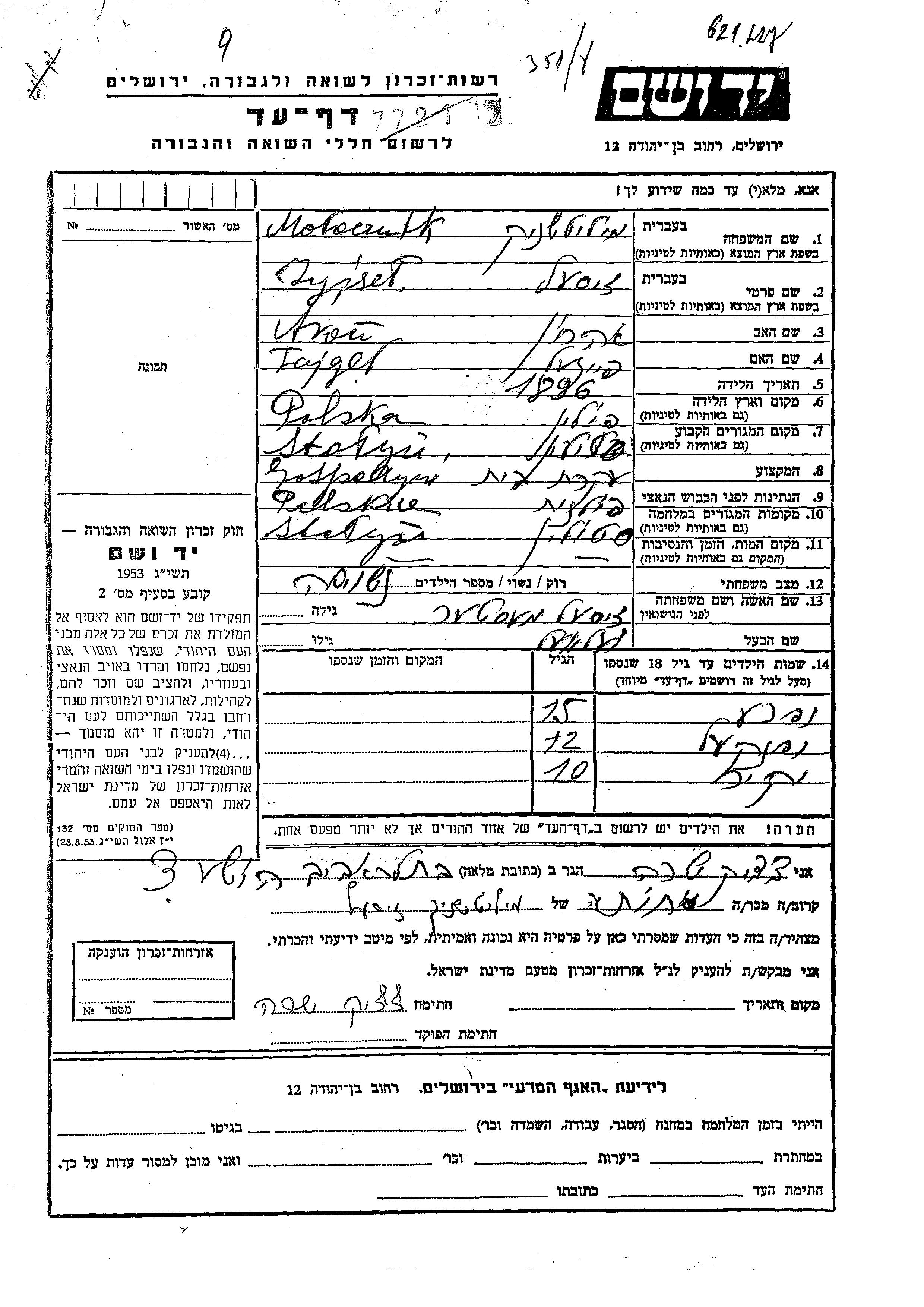 Zyjsel Molocznik, geb. Mester wurde im Jahr 1896 in Polen geboren. Sie war die Tochter von Aron und Fajgel. Sie war Hausfrau und mit Velvel Verheiratet. Vor dem Zweiten Weltkrieg lebte sie in Stolin, Polen. Während des Krieges war sie in Stolin, Polen.