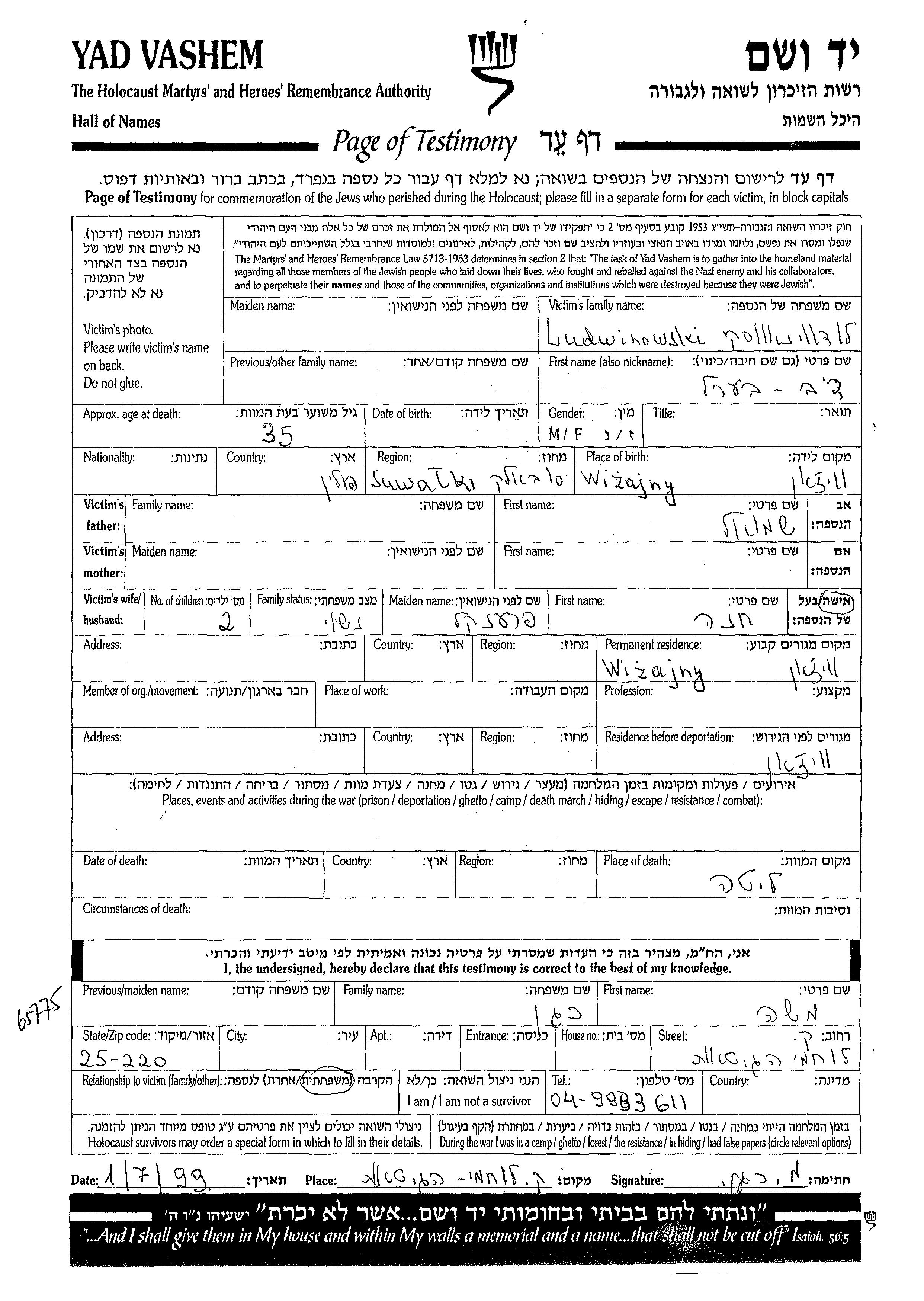 Dov Berl Ludwinowski wurde in Wizajny, Polen geboren. Er war der Sohn von Shmuel. Er war mit Khana, geb. Frenkel Verheiratet. Vor dem Zweiten Weltkrieg lebte er in Wizajny, Polen. Während des Krieges war er in Wizajny, Polen.
