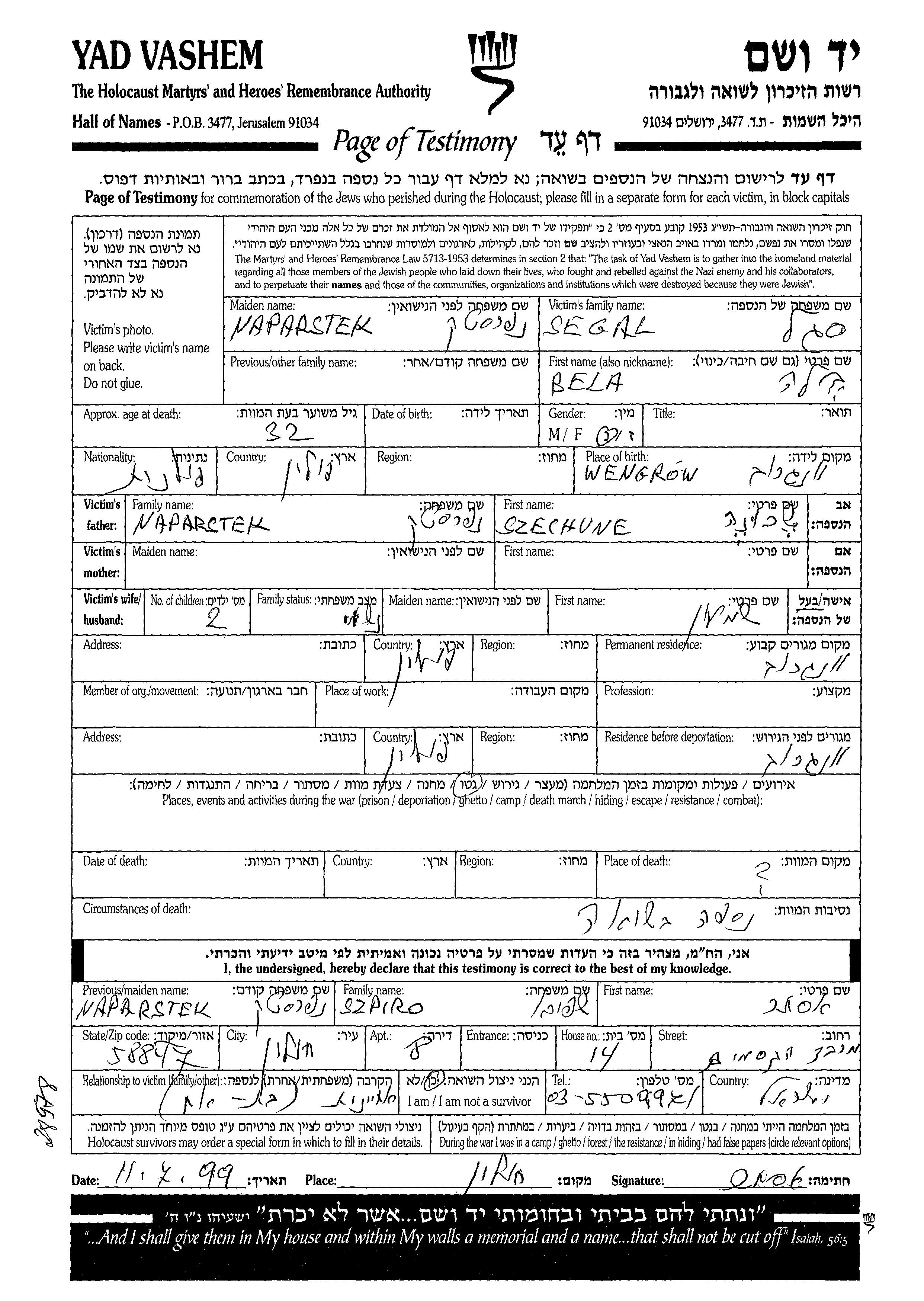 Bela Segal, geb. Naparstek wurde in Wengrow, Polen geboren. Sie war die Tochter von Szechune. Sie war mit Shimon Verheiratet. Vor dem Zweiten Weltkrieg lebte sie in Wengrow, Polen. Während des Krieges war sie in Wengrow, Polen.