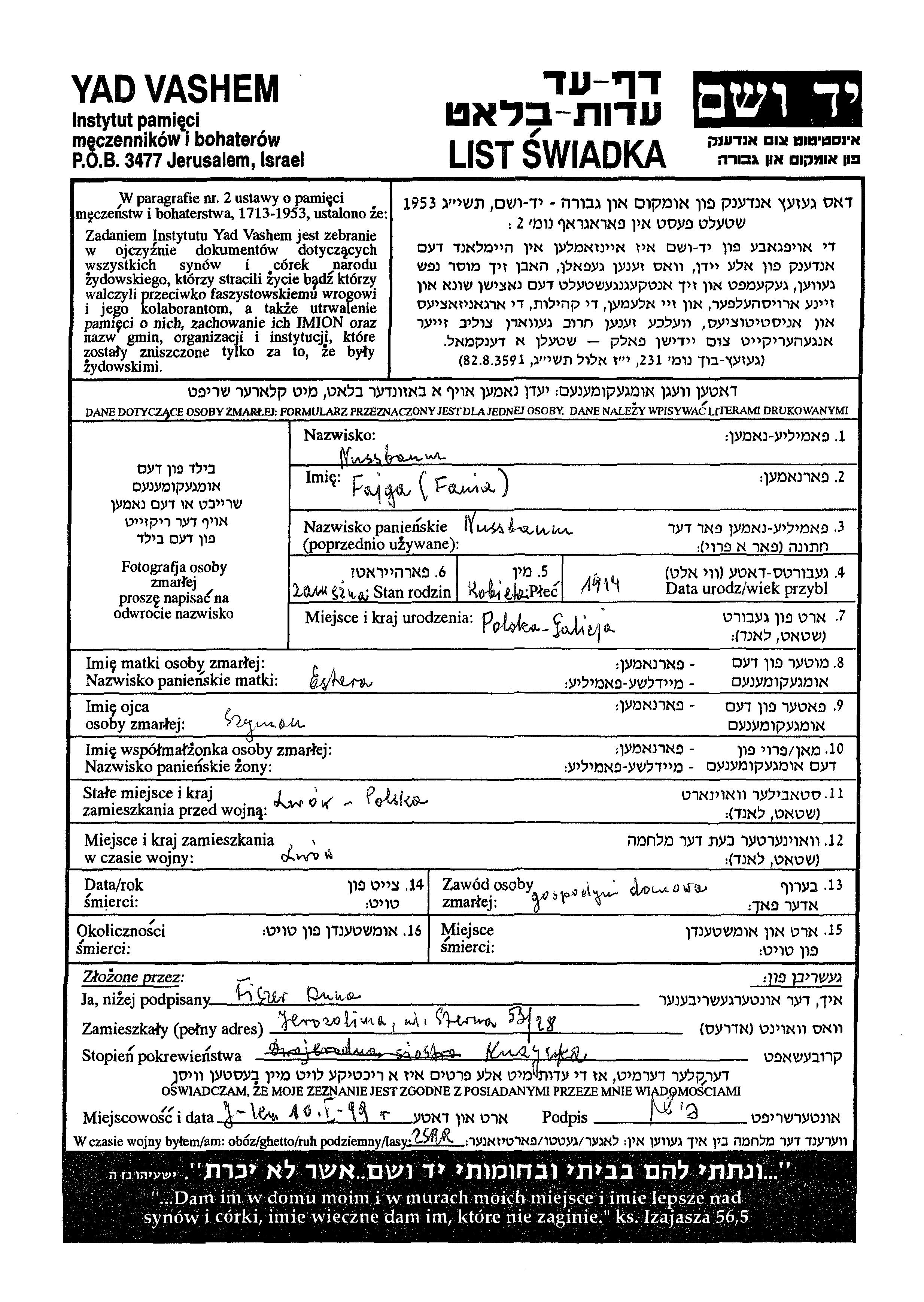 Nußbaum Fajga Fania 1914 Lwow, Polen Gedenkblatt