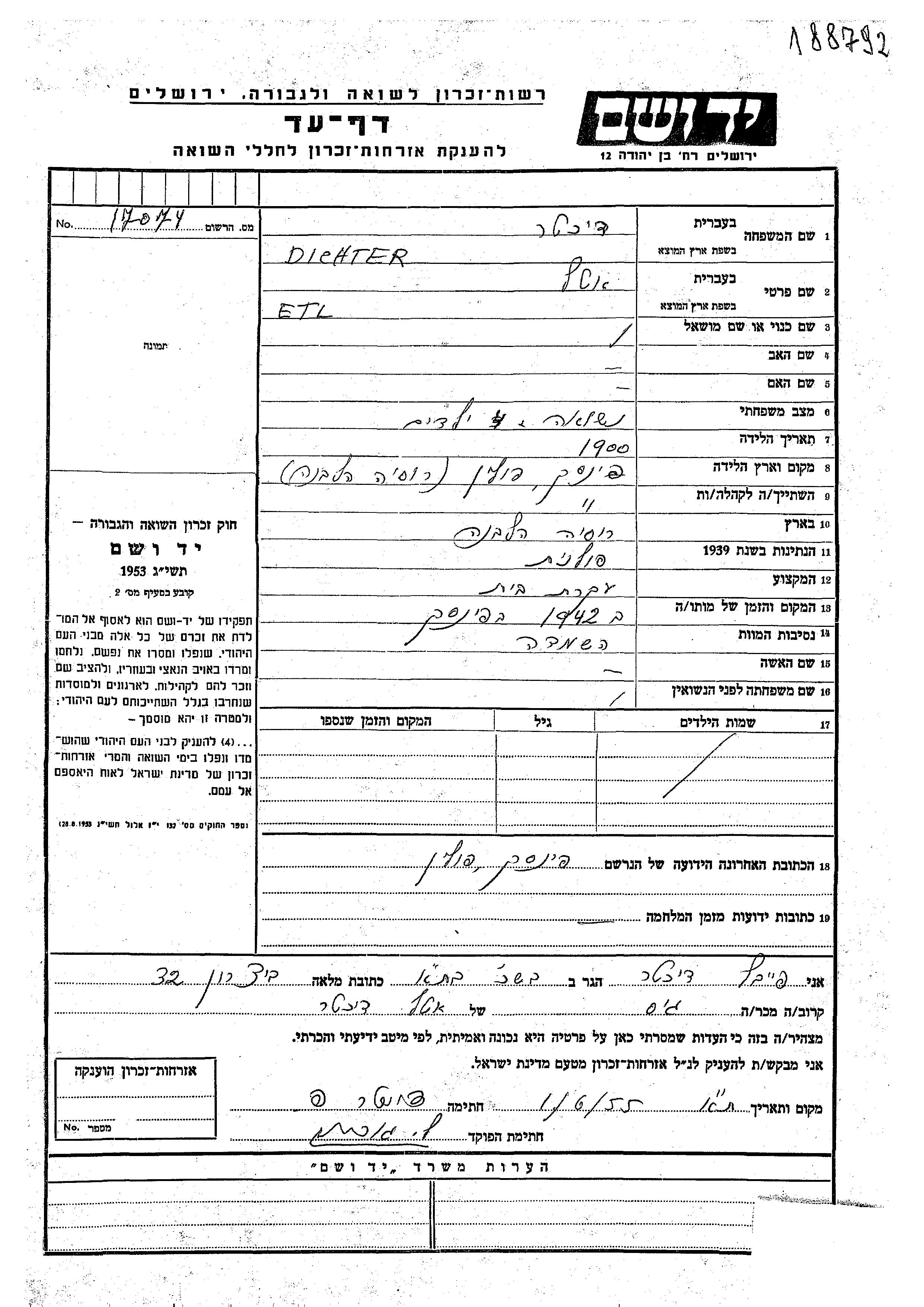 Etl Dichter wurde im Jahr 1900 in Pinsk, Polen geboren. Sie war Hausfrau und Verheiratet.