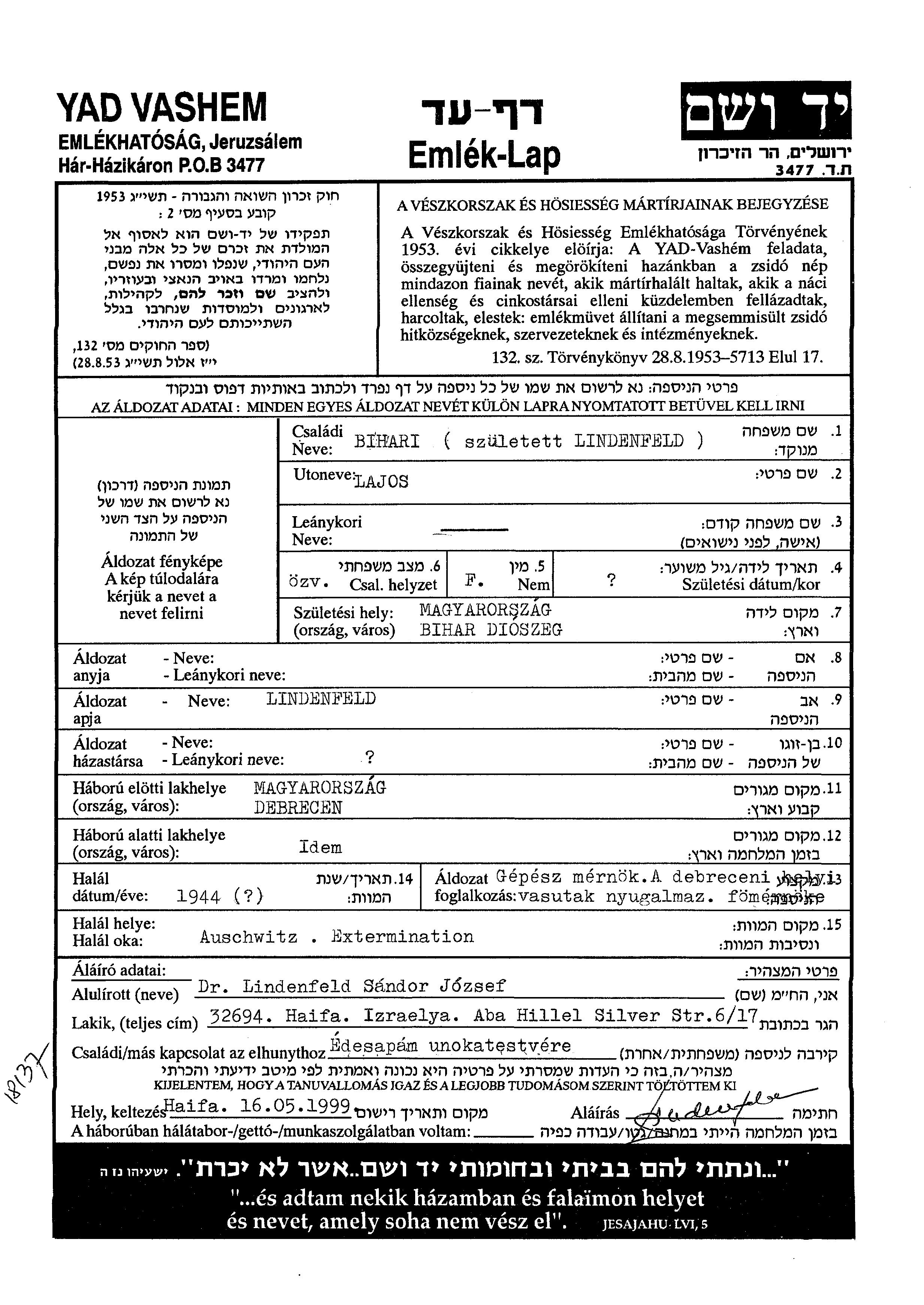 Lajos Bihari Lindenfeld wurde in Dioszeg, Rumänien geboren. Er war Gepeszmernok und Verwitwet. Vor dem Zweiten Weltkrieg lebte er in Debrecen, Ungarn. Während des Krieges war er in Debrecen, Ungarn.