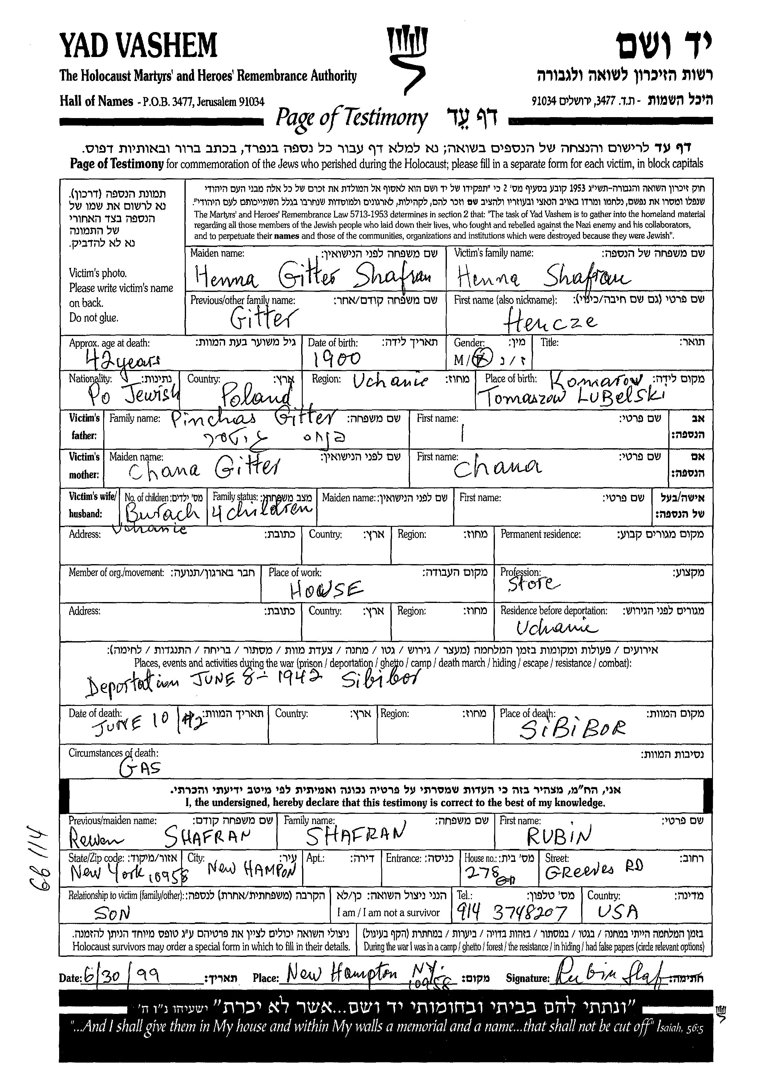 Henna Shafran, geb. Gitter wurde im Jahr 1900 in Tomaszow Lubelski, Polen geboren. Sie war die Tochter von Pinchas und Chana. Während des Krieges war sie in Uchanie, Polen.