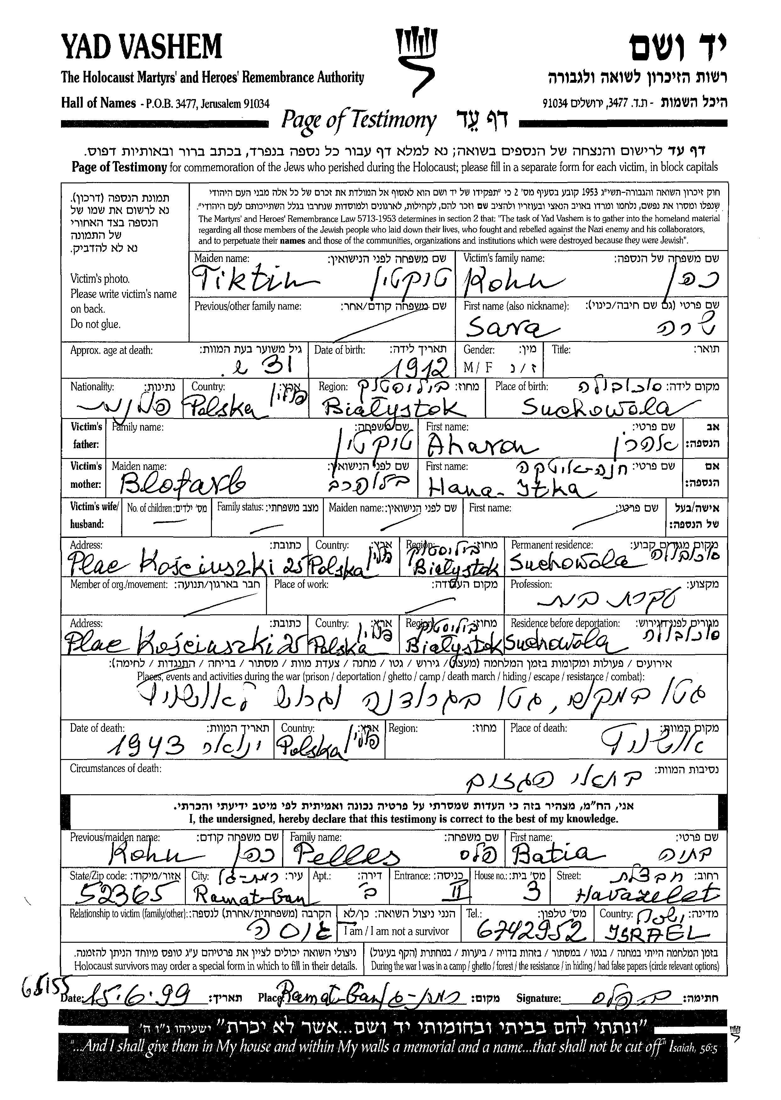 Sara Kohn, geb. Tiktin wurde im Jahr 1912 in Suchowola, Polen geboren. Sie war die Tochter von Aharon und Hana Itka. Sie war Hausfrau. Vor dem Zweiten Weltkrieg lebte sie in Suchowola, Polen. Während des Krieges war sie in Suchowola, Polen.
