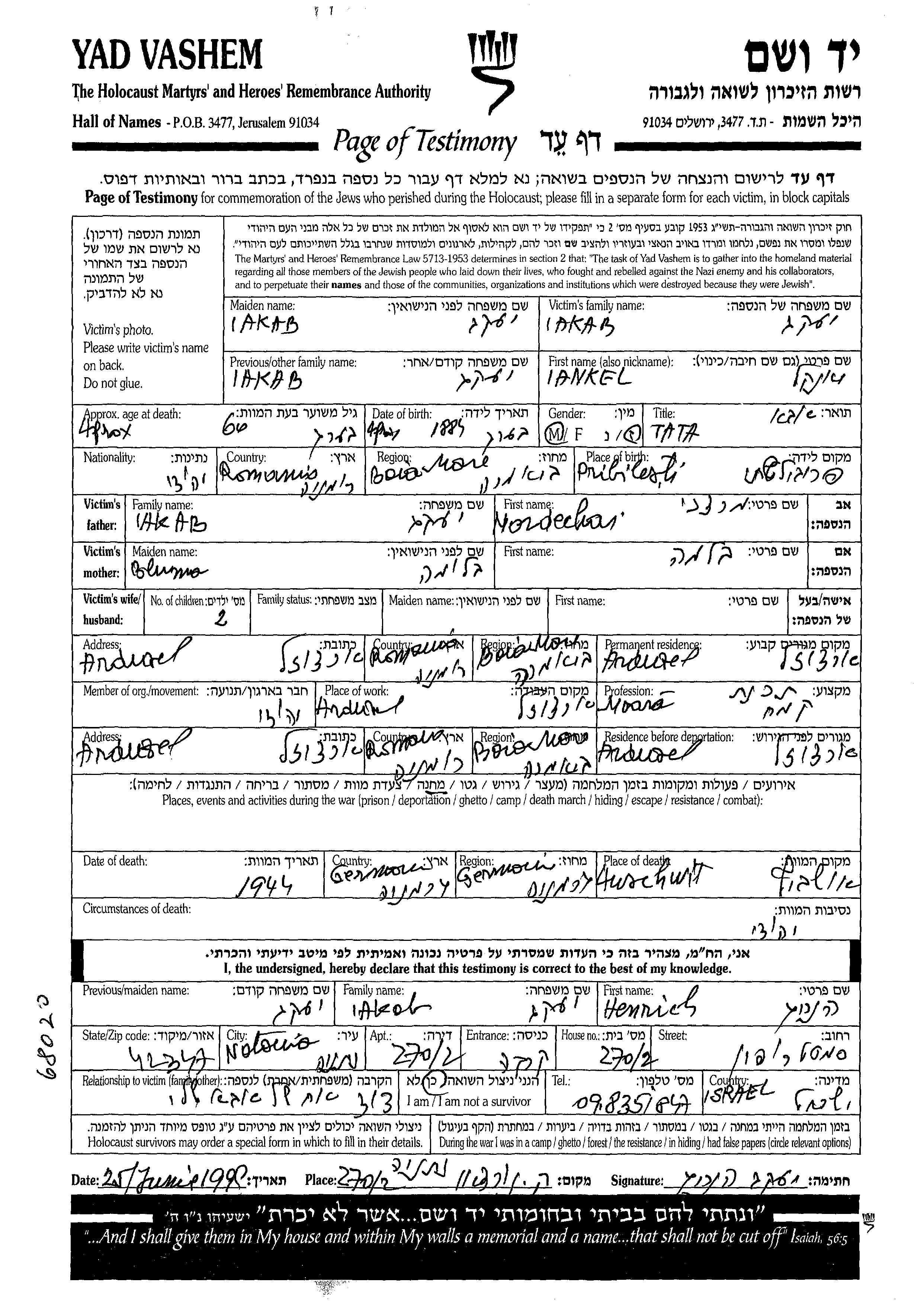 Iankel Iakab wurde im Jahr 1884 in Pribilesti, Rumänien geboren. Er war der Sohn von Mordechai und Bluma. Er war Verheiratet. Vor dem Zweiten Weltkrieg lebte er in Arduzel, Rumänien. Während des Krieges war er in Arduzel, Rumänien.