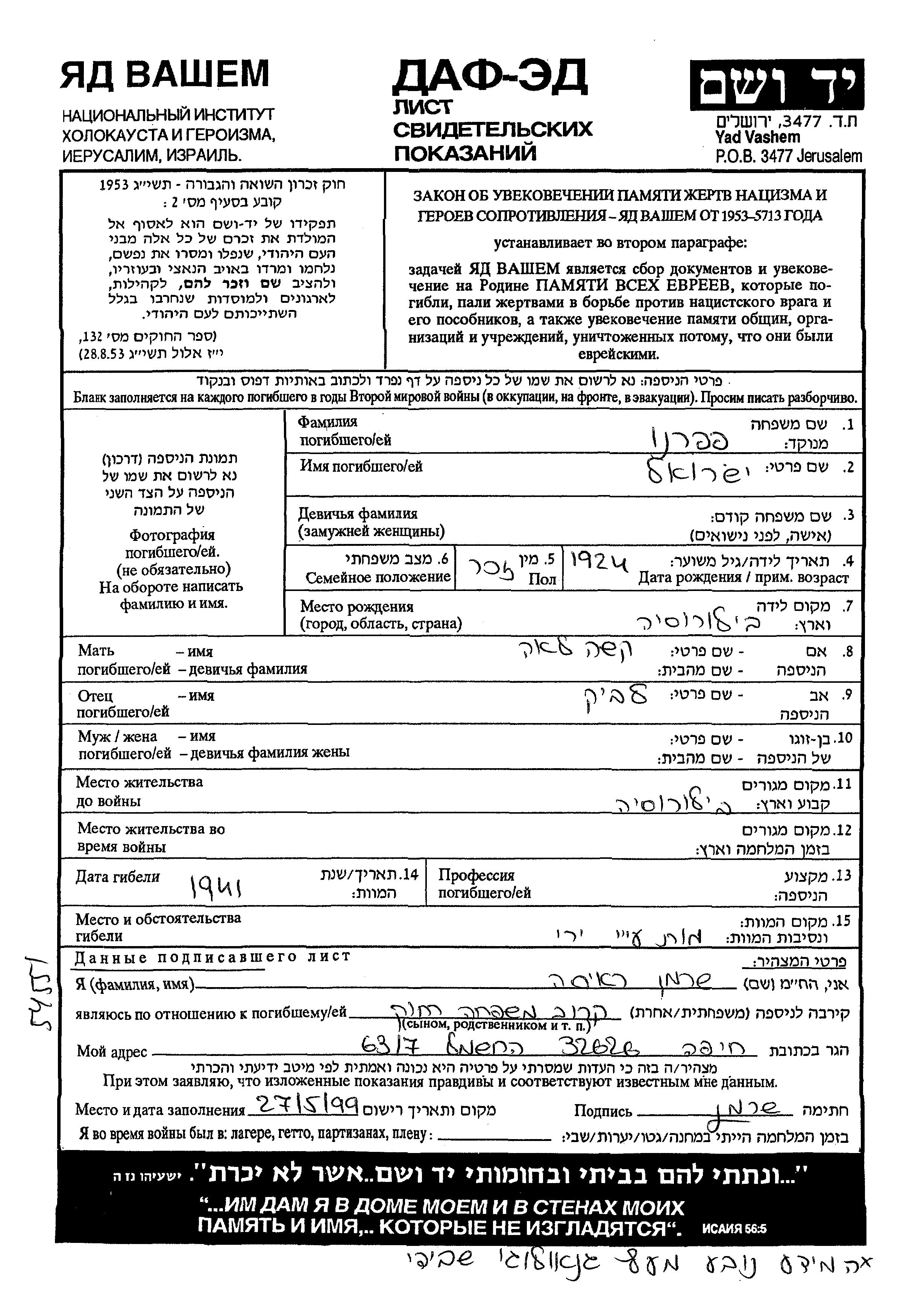 Yisrael wurde in der Schoah ermordet. Todesort: unbekannt im Jahr 1941.