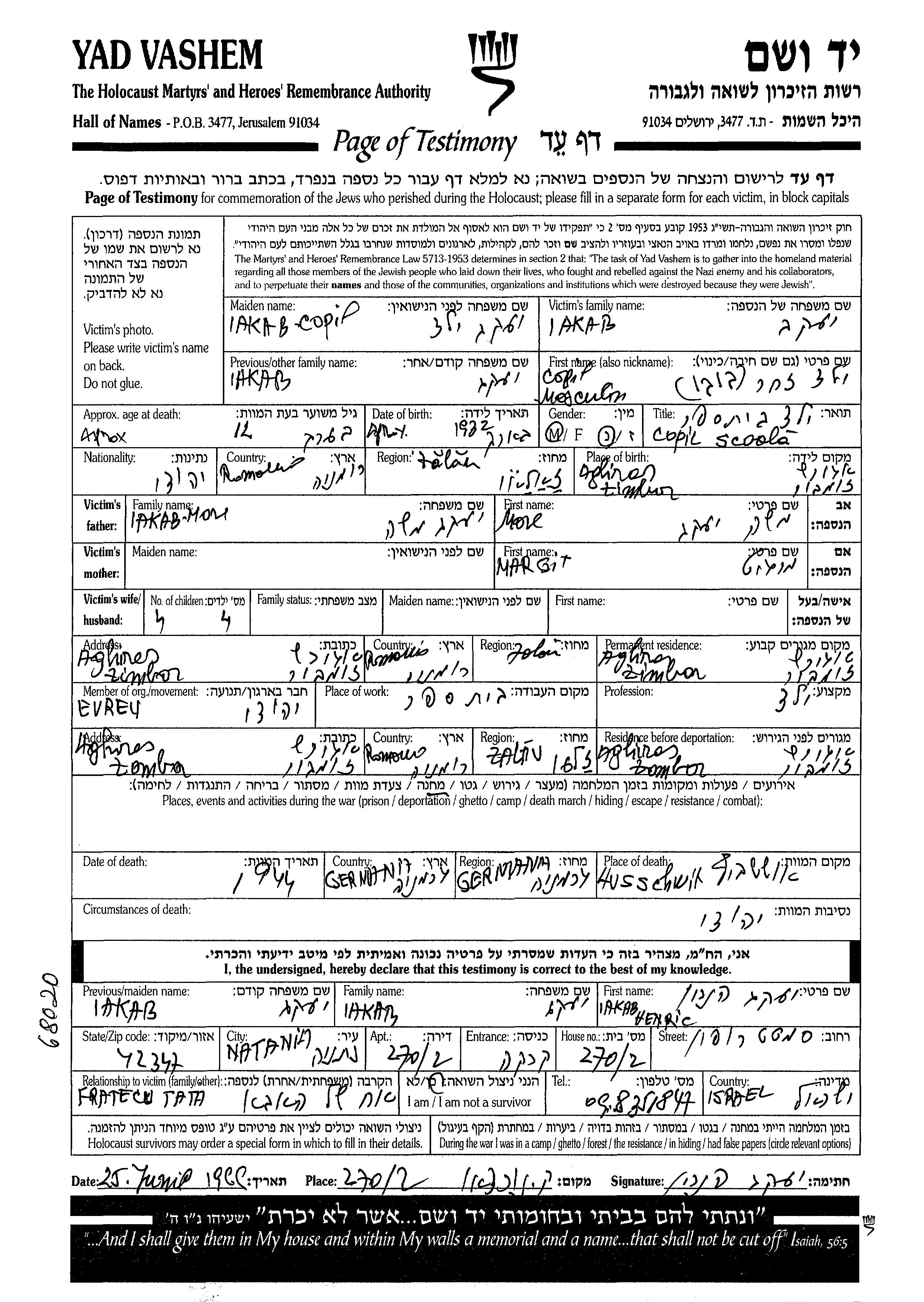 Bobo Iakab wurde im Jahr 1932 in Aghires, Rumänien geboren. Er war der Sohn von Mose Yaakov und Margit. Er war Kind. Vor dem Zweiten Weltkrieg lebte er in Aghires, Rumänien. Während des Krieges war er in Aghires, Rumänien.