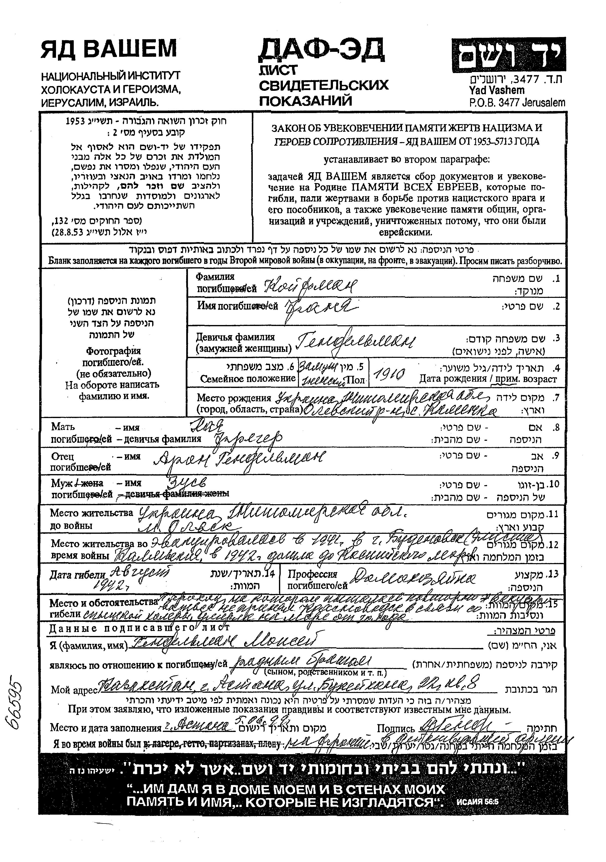 Koifman Fanya 1910 Olevsk, Ukraine (UdSSR) Gedenkblatt