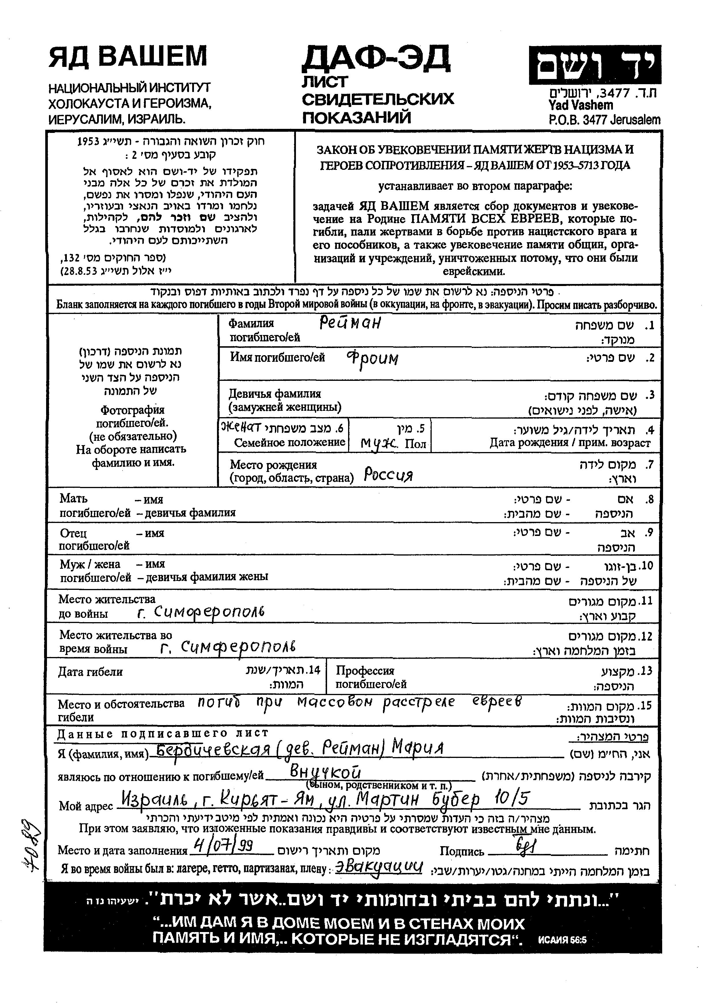 Froim Reiman wurde in Russland (UdSSR) geboren. Er war Verheiratet. Vor dem Zweiten Weltkrieg lebte er in Simferopol, Russland (UdSSR). Während des Krieges war er in Simferopol, Russland (UdSSR).