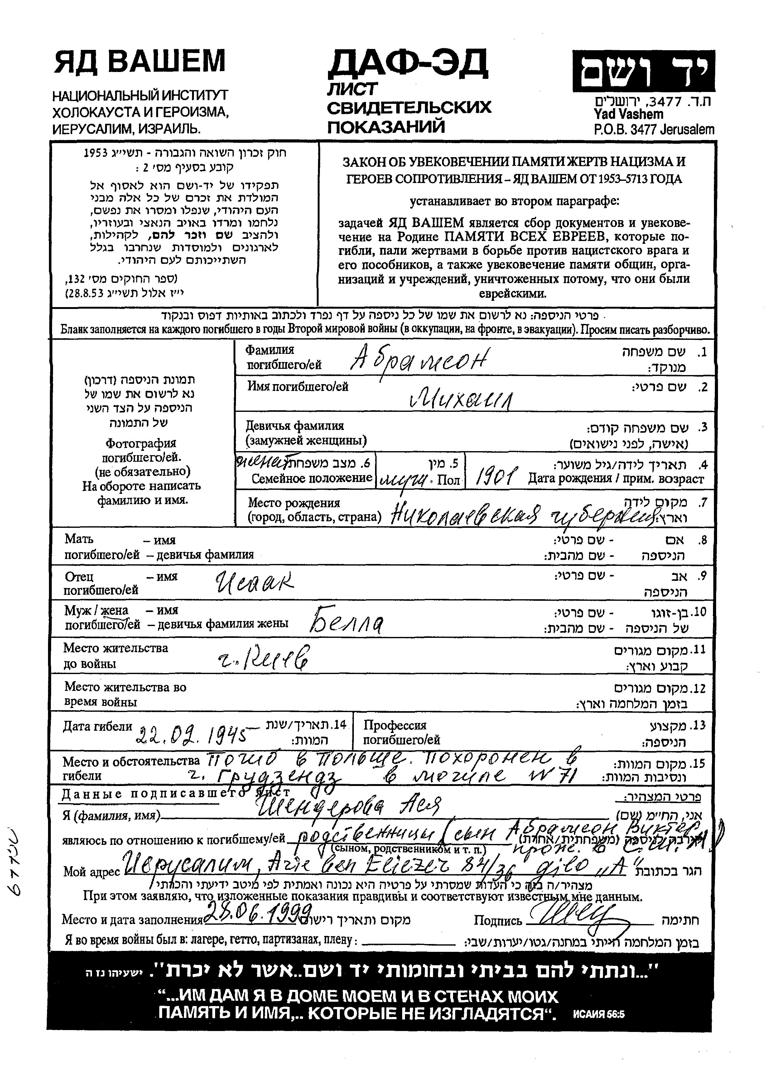 Mikhail wurde in der Schoah ermordet. Todesort: Grudziadz, Polen im Jahr 1945.