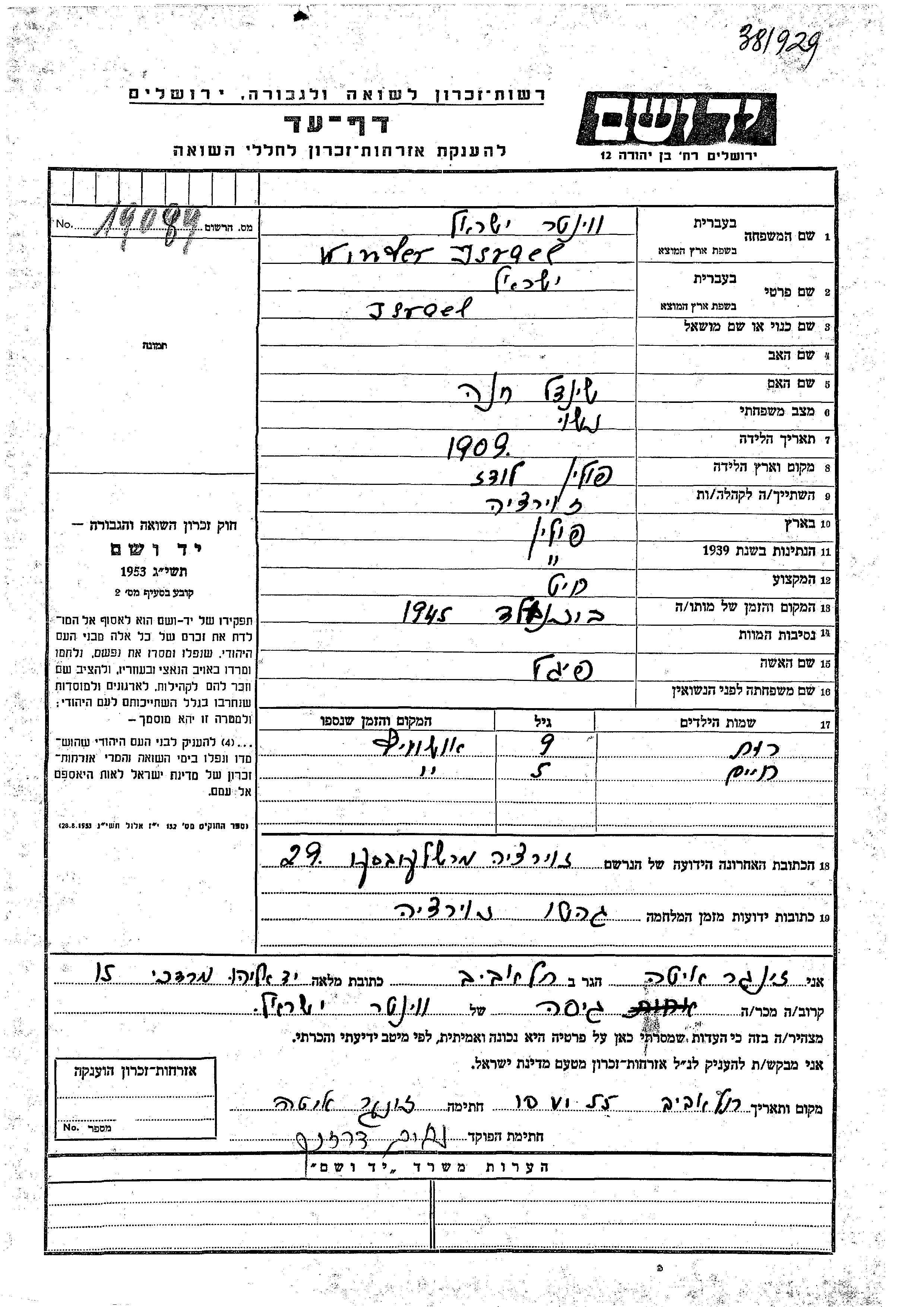 Israel Winter wurde im Jahr 1909 in Lodz, Polen geboren. Er war der Sohn von Sheindl Khana. Er war Schneider und mit Feigl Verheiratet. Vor dem Zweiten Weltkrieg lebte er in Zawiercie, Polen. Während des Krieges war er in Zawiercie, Polen.