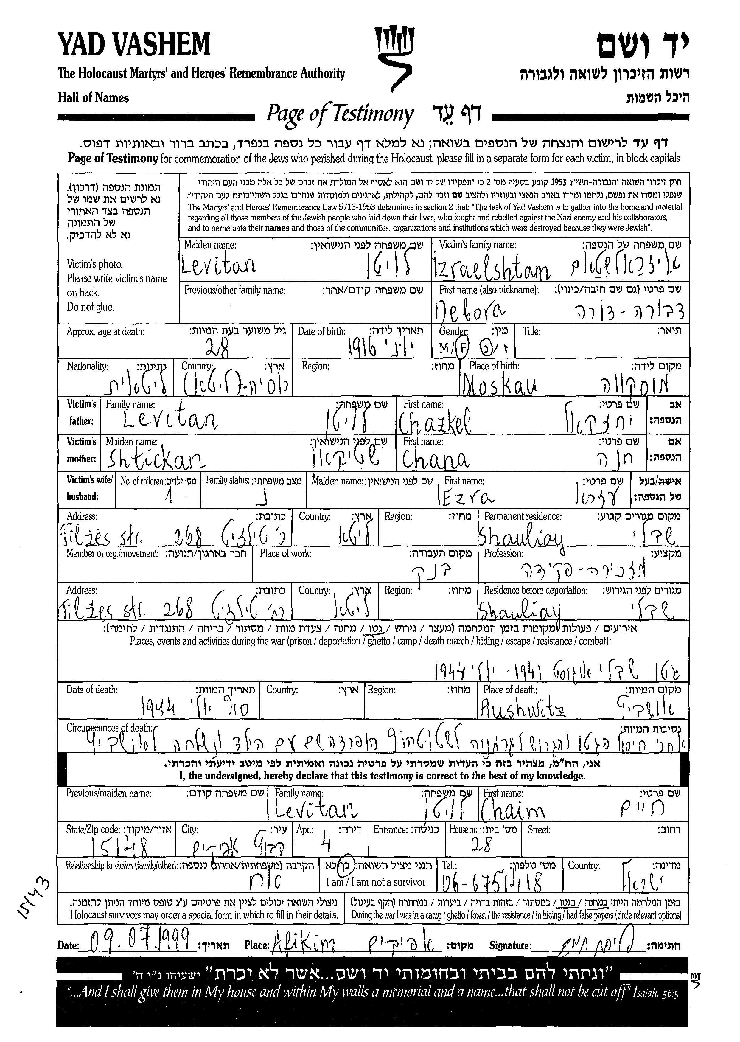 Debora Dora Izraelshtam, geb. Levitan wurde im Jahr 1916 in Moskva, Russland (UdSSR) geboren. Sie war die Tochter von Chazkel und Chana. Sie war Sekretärin und mit Ezra Verheiratet. Vor dem Zweiten Weltkrieg lebte sie in Szabla, Litauen. Während des Krieges war sie in Szabla, Litauen.