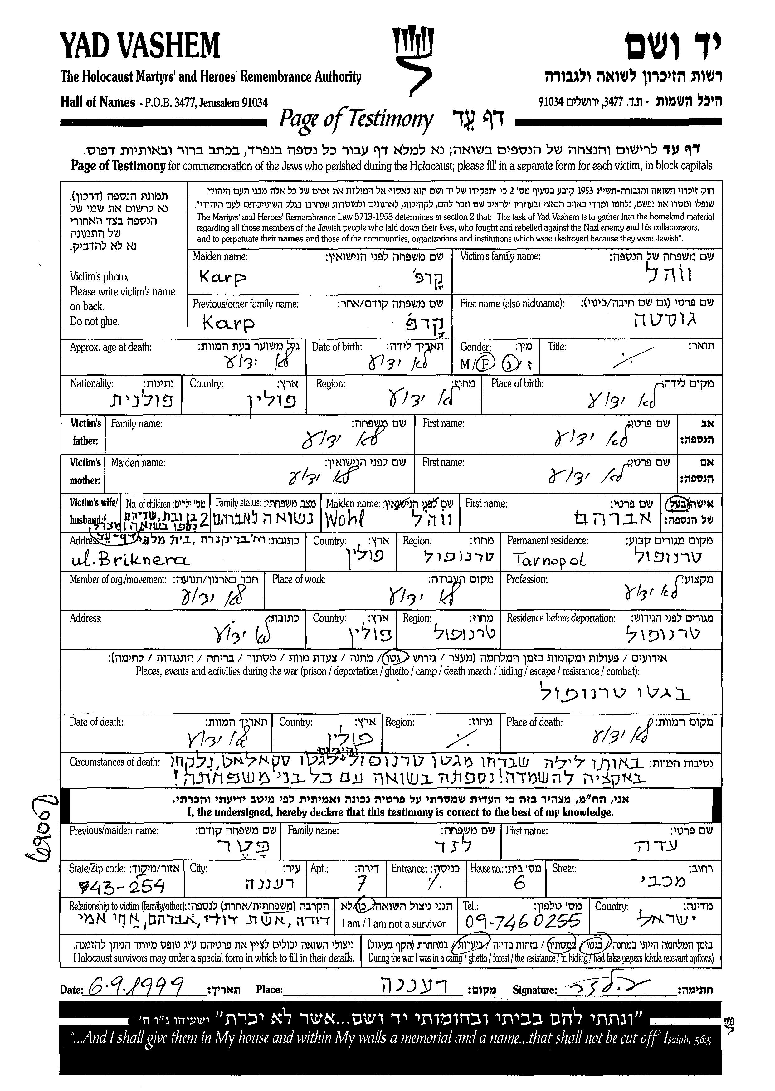 Gusta Wohl, geb. Karp wurde in Polen geboren. Sie war mit Avraham Verheiratet. Vor dem Zweiten Weltkrieg lebte sie in Tarnopol, Polen. Während des Krieges war sie in Tarnopol, Polen.