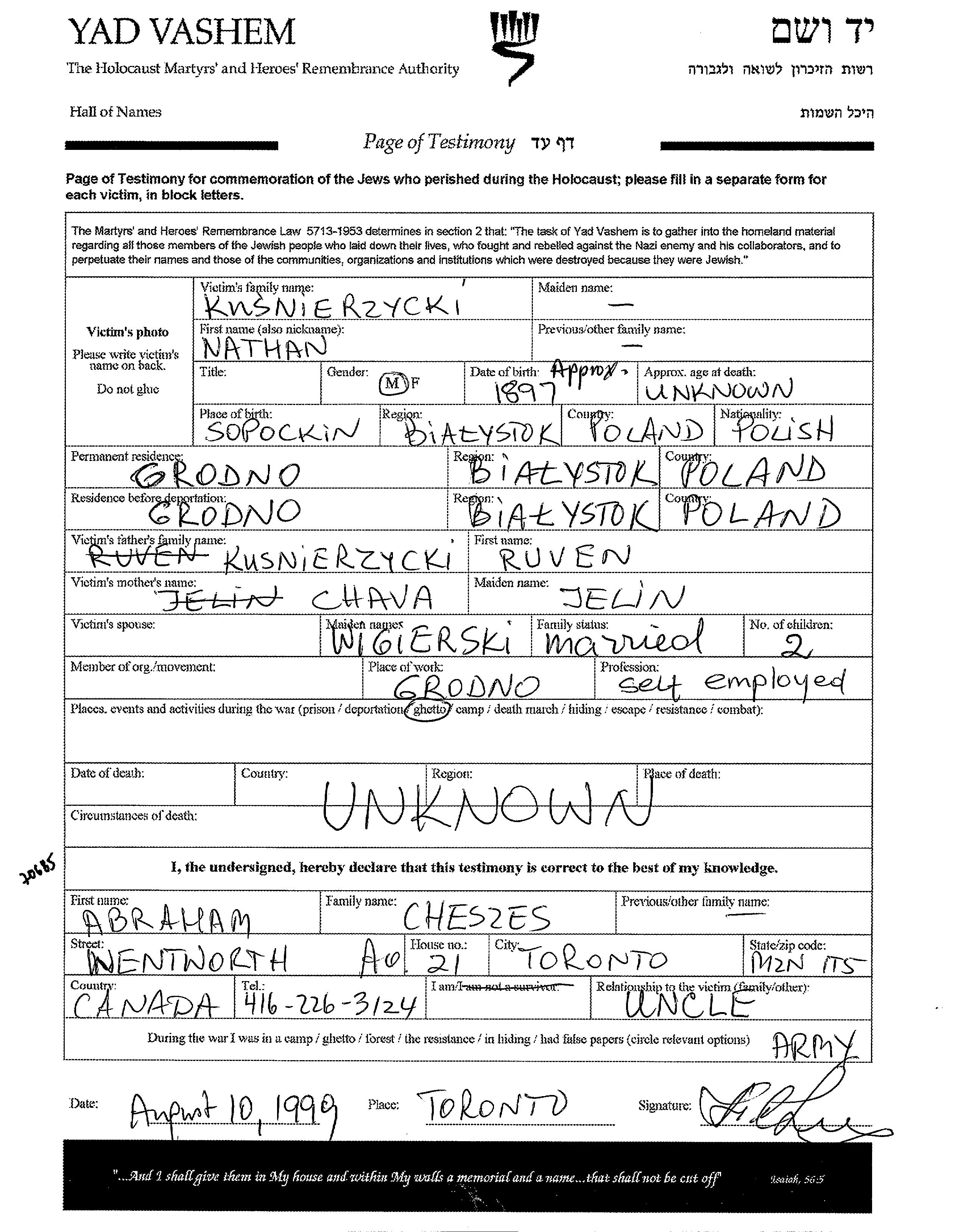 Nathan Kusnierzycki wurde im Jahr 1897 in Sopockin, Polen geboren. Er war der Sohn von Ruven und Chava. Er war Selbständig und Verheiratet. Vor dem Zweiten Weltkrieg lebte er in Grodno, Polen. Während des Krieges war er in Grodno, Polen.