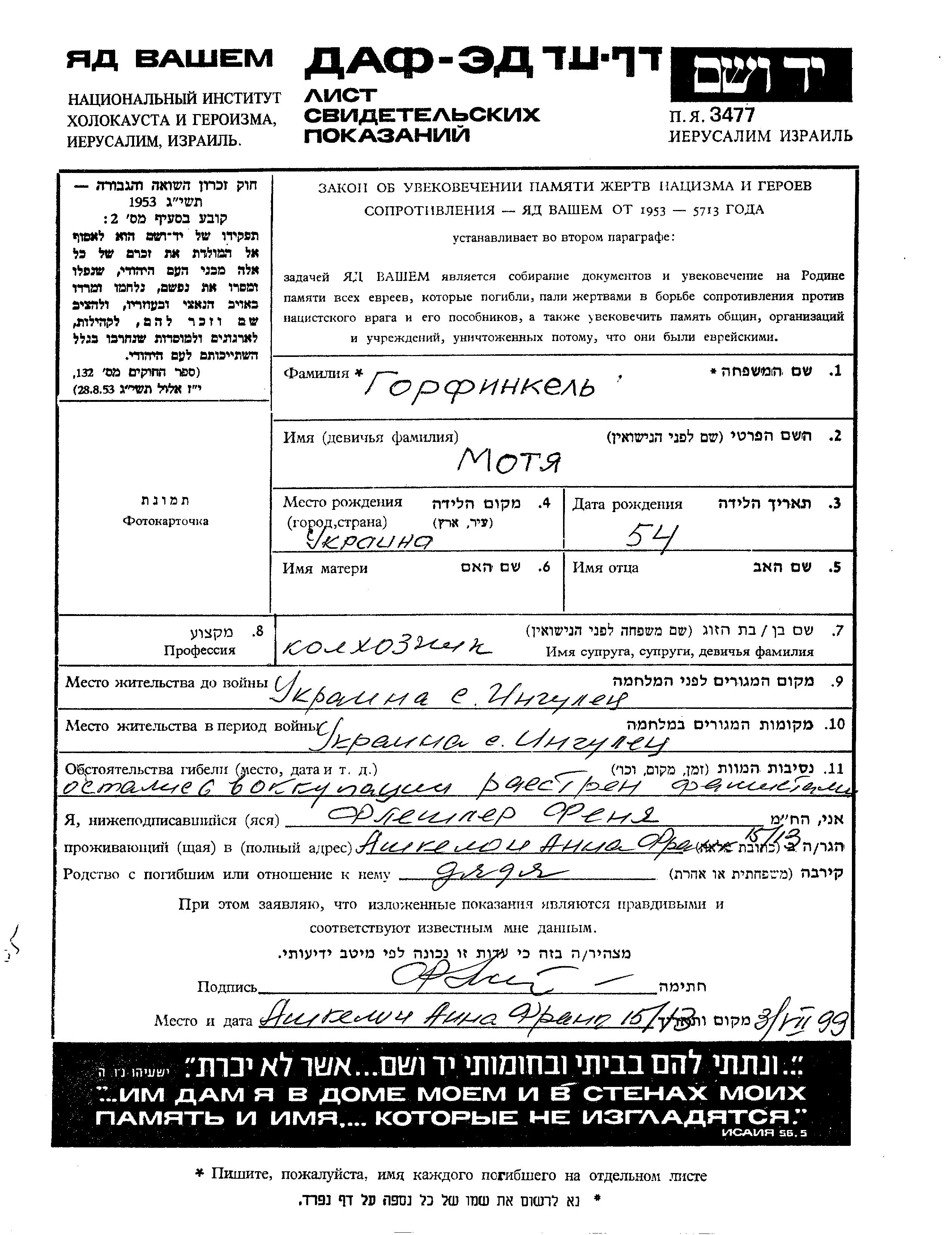 Motya Gorfinkel wurde in Ukraine (UdSSR) geboren. Er war Kolchosbauer/-bäuerin. Vor dem Zweiten Weltkrieg lebte er in Ingulets, Ukraine (UdSSR). Während des Krieges war er in Ingulets, Ukraine (UdSSR).