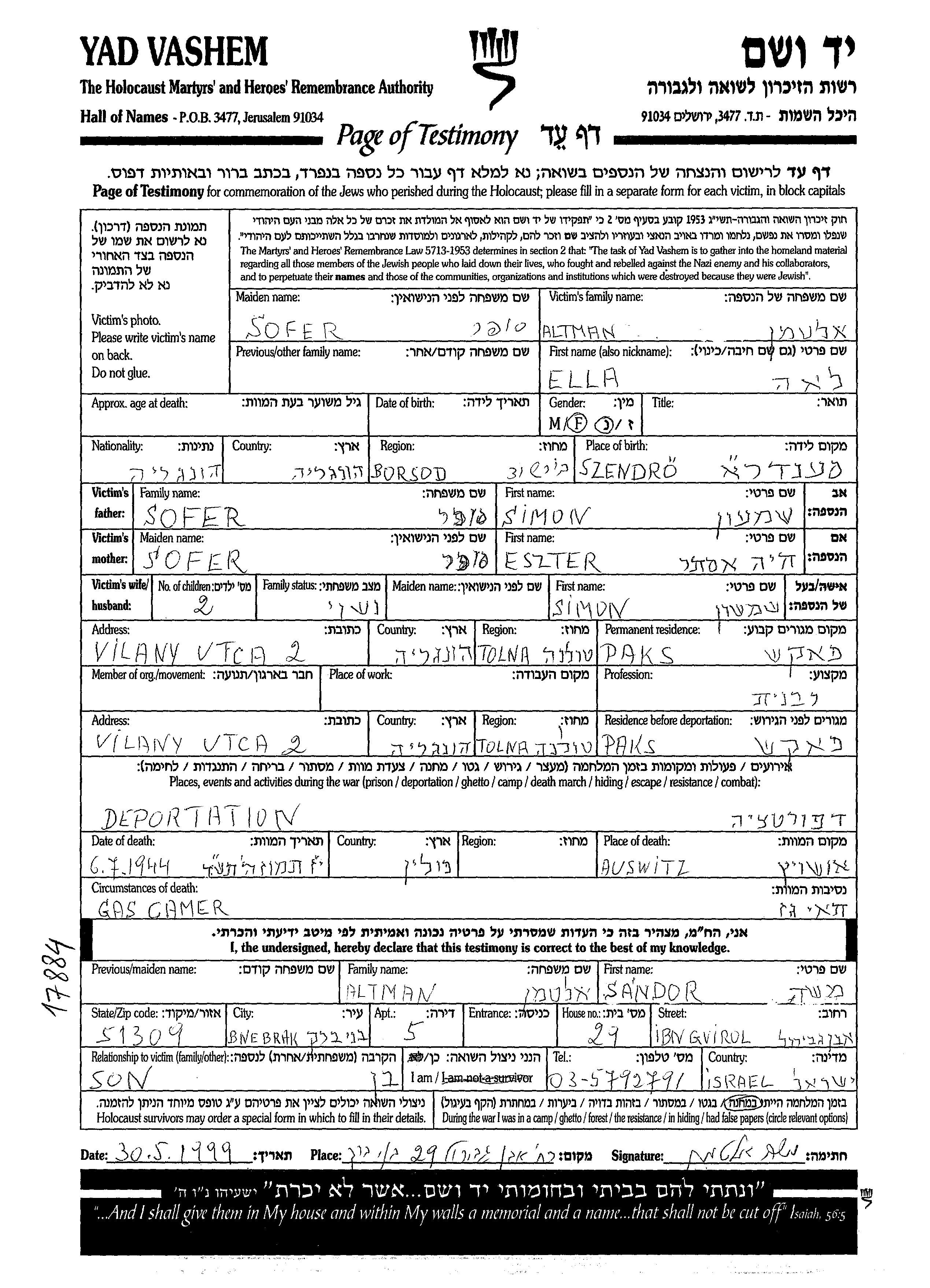 Ella Lea Altman, geb. Sofer wurde in Szendro, Ungarn geboren. Sie war die Tochter von Simon und Eszter Dalia. Sie war Frau eines rabbiners und mit Simon Shimshon Verheiratet. Vor dem Zweiten Weltkrieg lebte sie in Paks, Ungarn. Während des Krieges war sie in Paks, Ungarn.