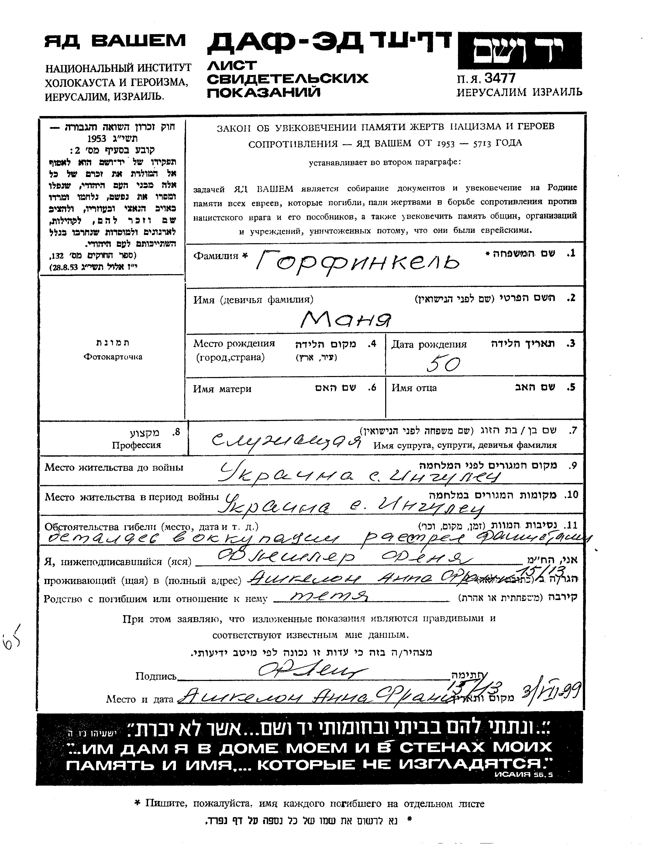 Manya Gorfinkel wurde in Ingulets, Ukraine (UdSSR) geboren. Sie war Angestellte/-r. Vor dem Zweiten Weltkrieg lebte sie in Ingulets, Ukraine (UdSSR). Während des Krieges war sie in Ingulets, Ukraine (UdSSR).