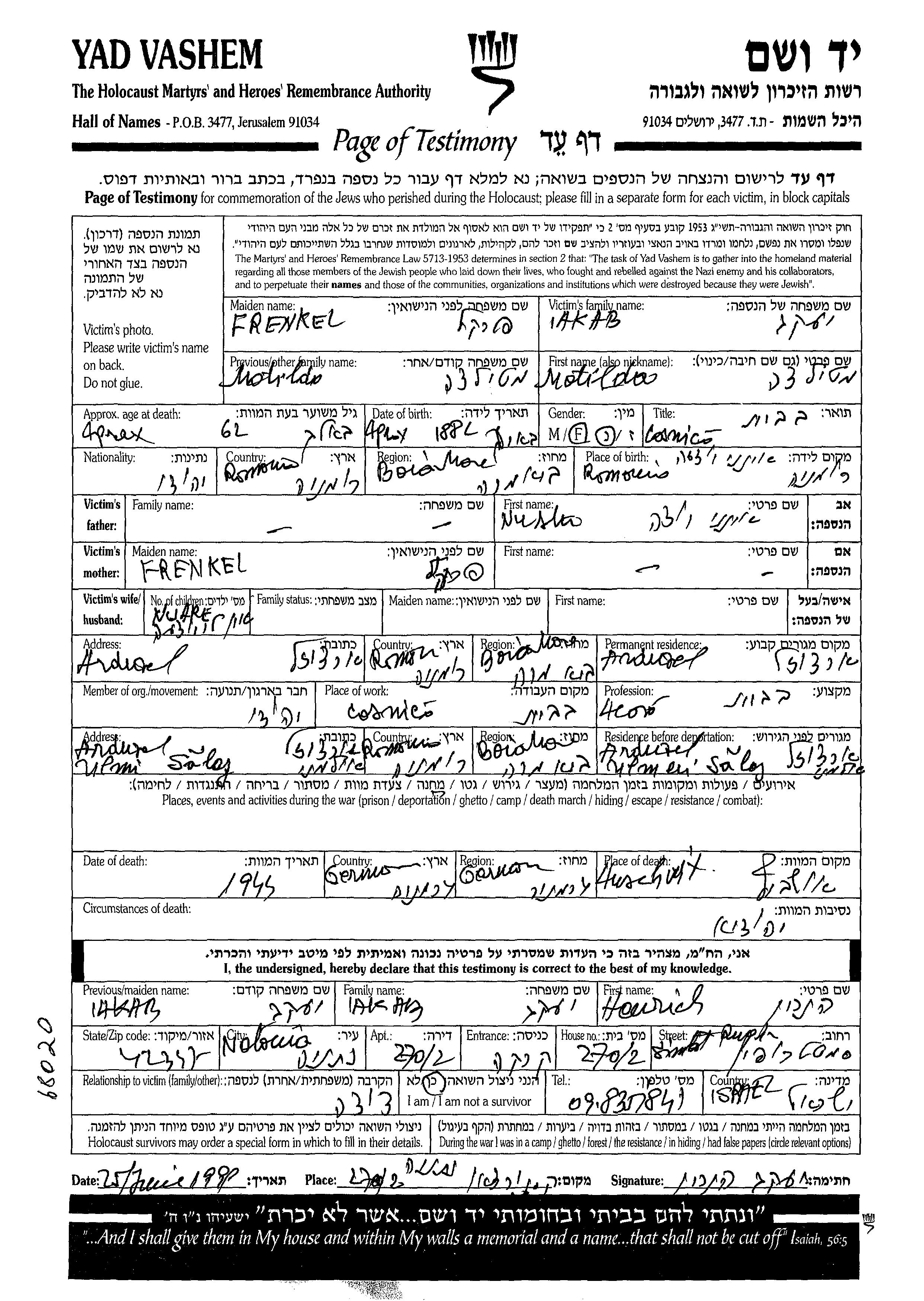Matilda Iakab, geb. Frenkel wurde im Jahr 1882 in Baia Mare, Rumänien geboren. Sie war Hausfrau. Vor dem Zweiten Weltkrieg lebte sie in Arduzel, Rumänien. Während des Krieges war sie in Arduzel, Rumänien.