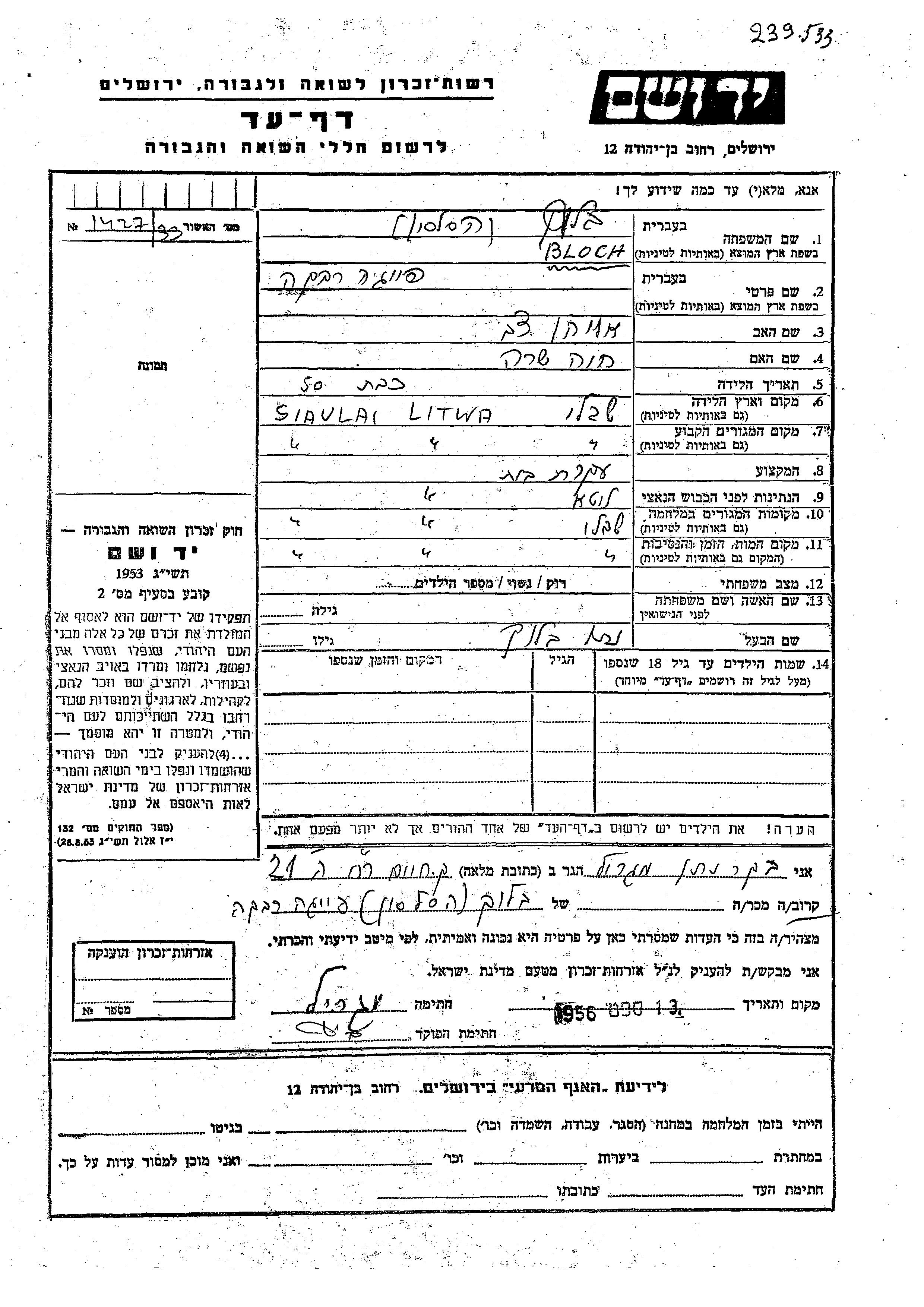 Bloch Feiga Rivka Siauliai, Litauen Gedenkblatt