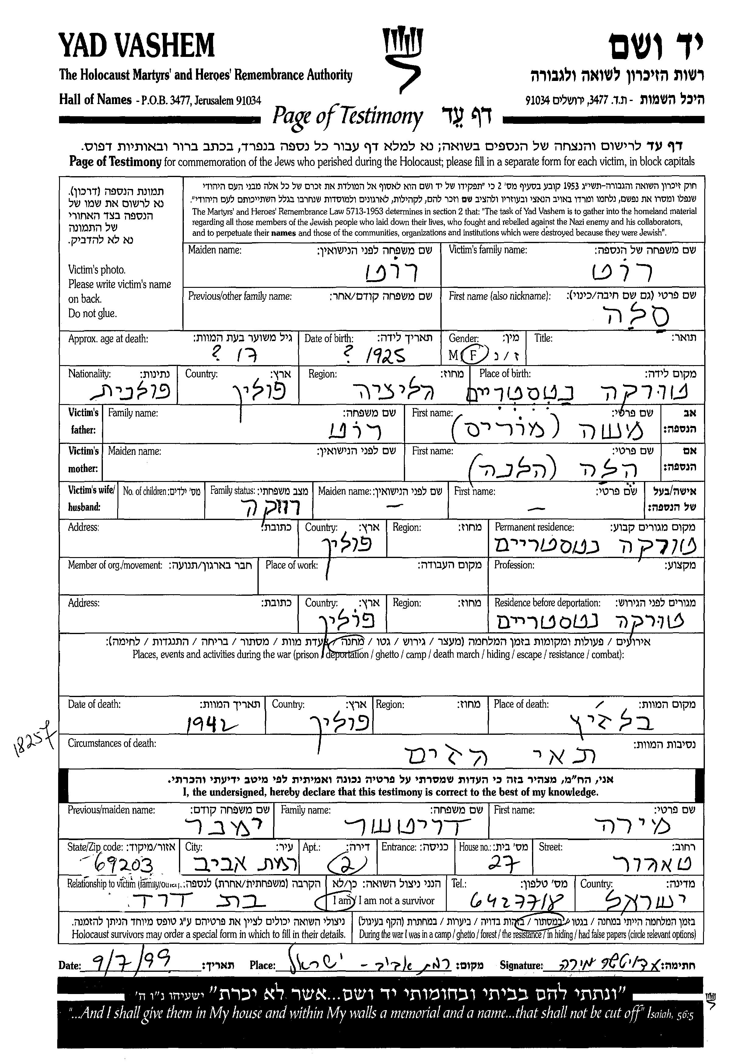 Sala Rut wurde im Jahr 1925 in Turka nad Stryjem, Polen geboren. Sie war die Tochter von Moshe Moris und Hela Helena. Sie war Ledig. Vor dem Zweiten Weltkrieg lebte sie in Turka nad Stryjem, Polen. Während des Krieges war sie in Turka nad Stryjem, Polen.