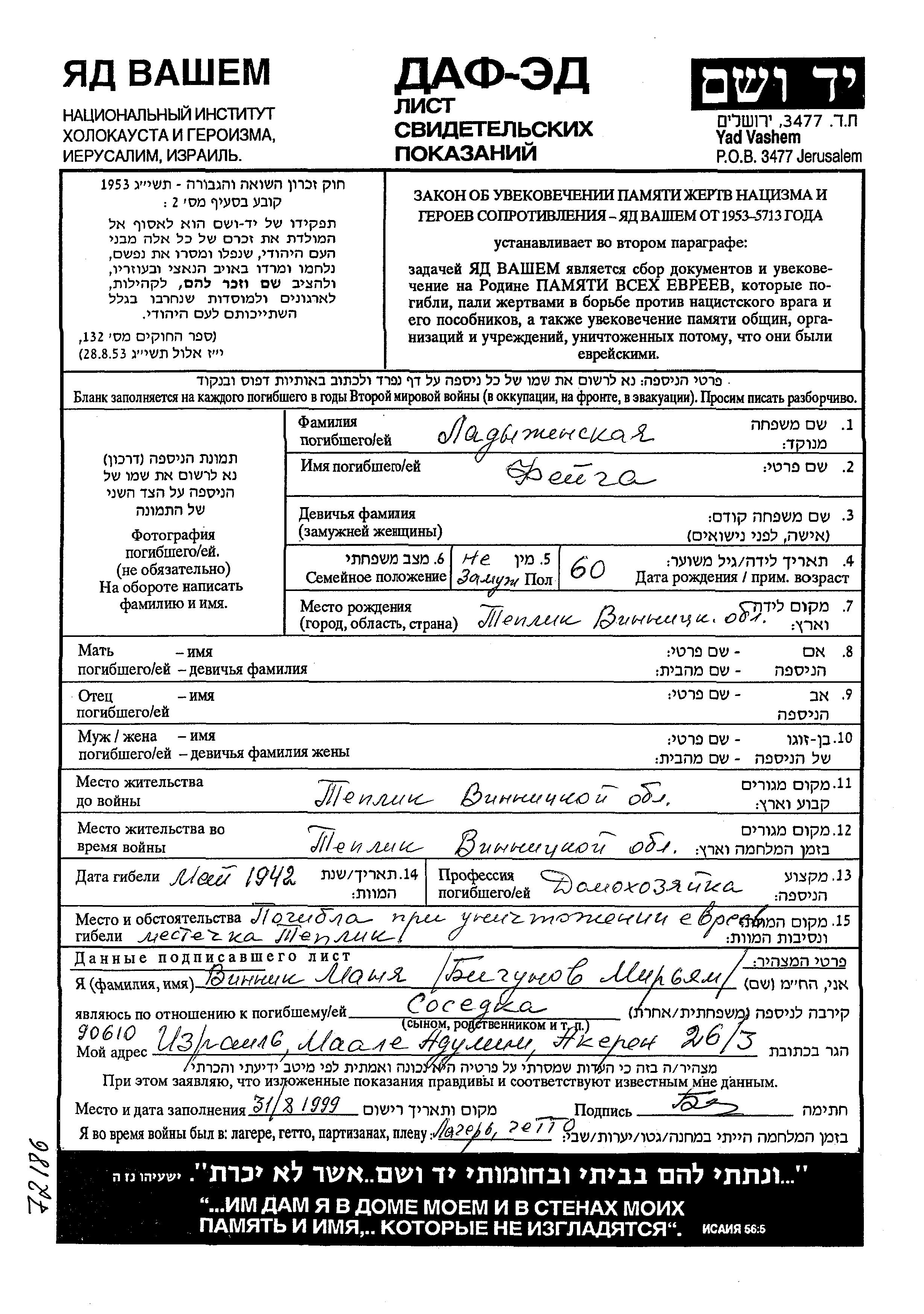 Feiga Ladyzhenski wurde in Teplik, Ukraine (UdSSR) geboren. Sie war Hausfrau und Ledig. Vor dem Zweiten Weltkrieg lebte sie in Teplik, Ukraine (UdSSR). Während des Krieges war sie in Teplik, Ukraine (UdSSR).