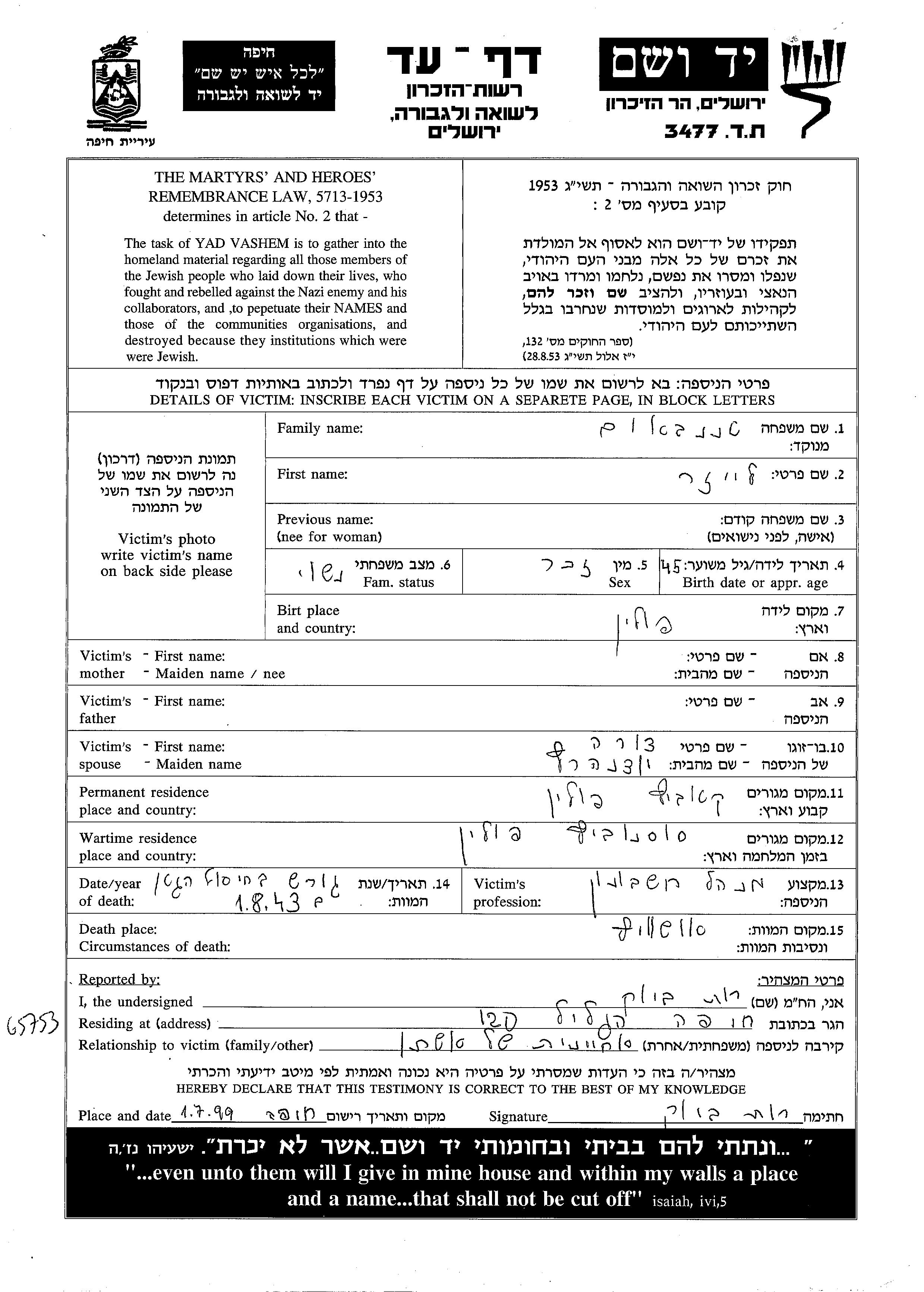 Leizer wurde in der Schoah ermordet. Todesort: Auschwitz, Polen im Jahr 1943.