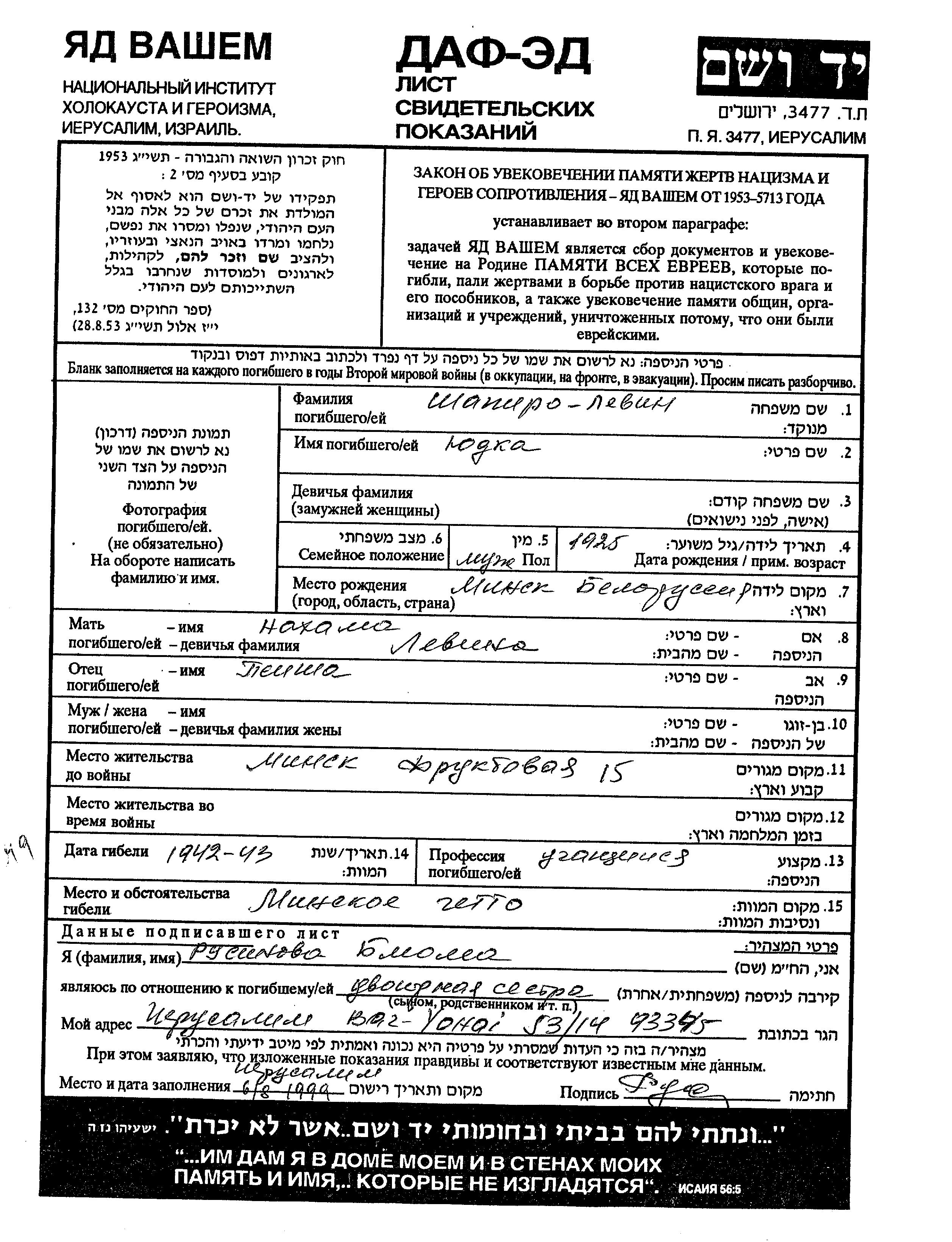 Yudka wurde in der Schoah ermordet. Todesort: Minsk, Weißrussland (UdSSR) im Jahr 1942.