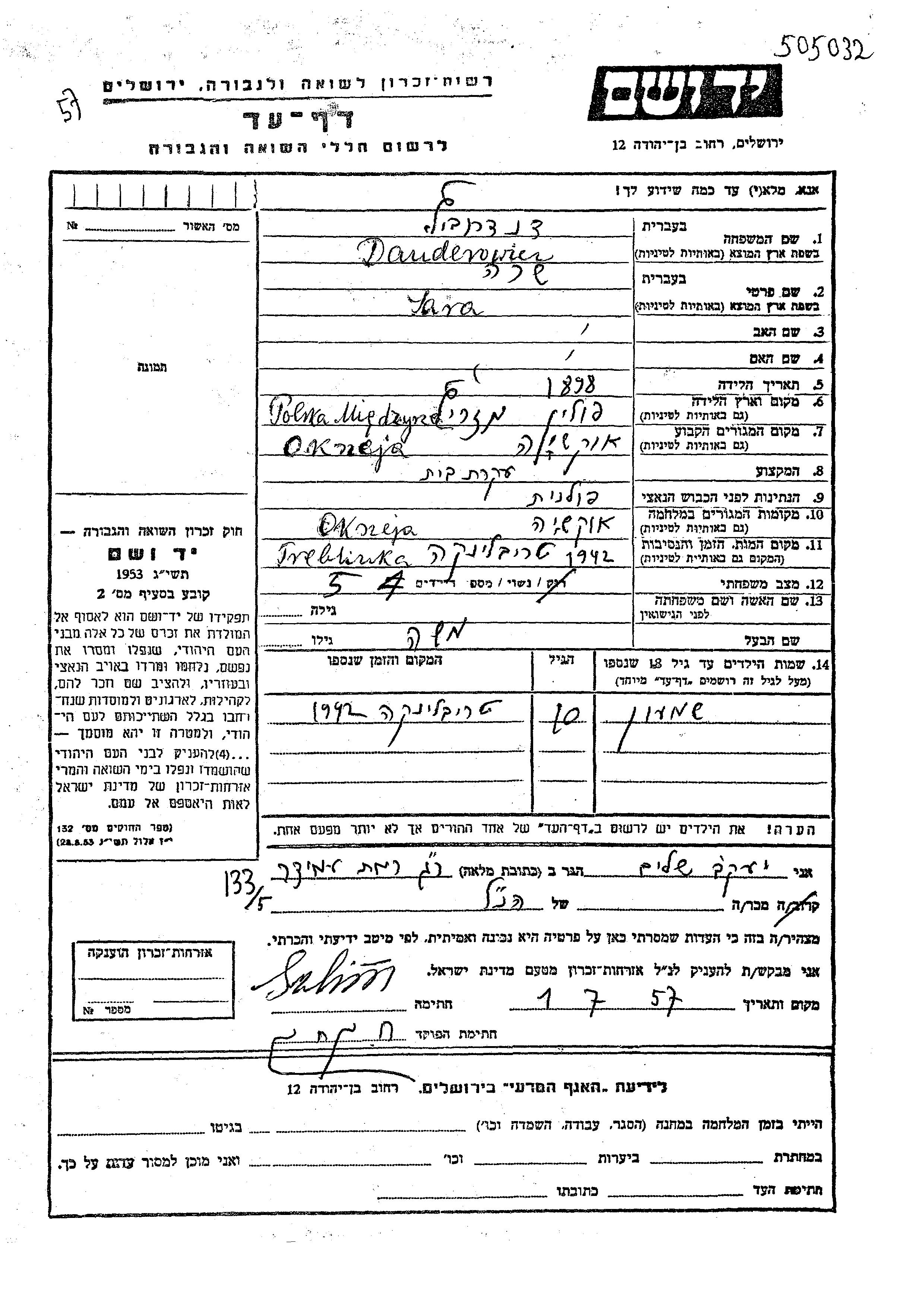 Sara Danderowicz wurde im Jahr 1898 in Miedzyrzec, Polen geboren. Sie war Hausfrau und mit Moshe Verheiratet. Vor dem Zweiten Weltkrieg lebte sie in Okrzeja, Polen. Während des Krieges war sie in Okrzeja, Polen.