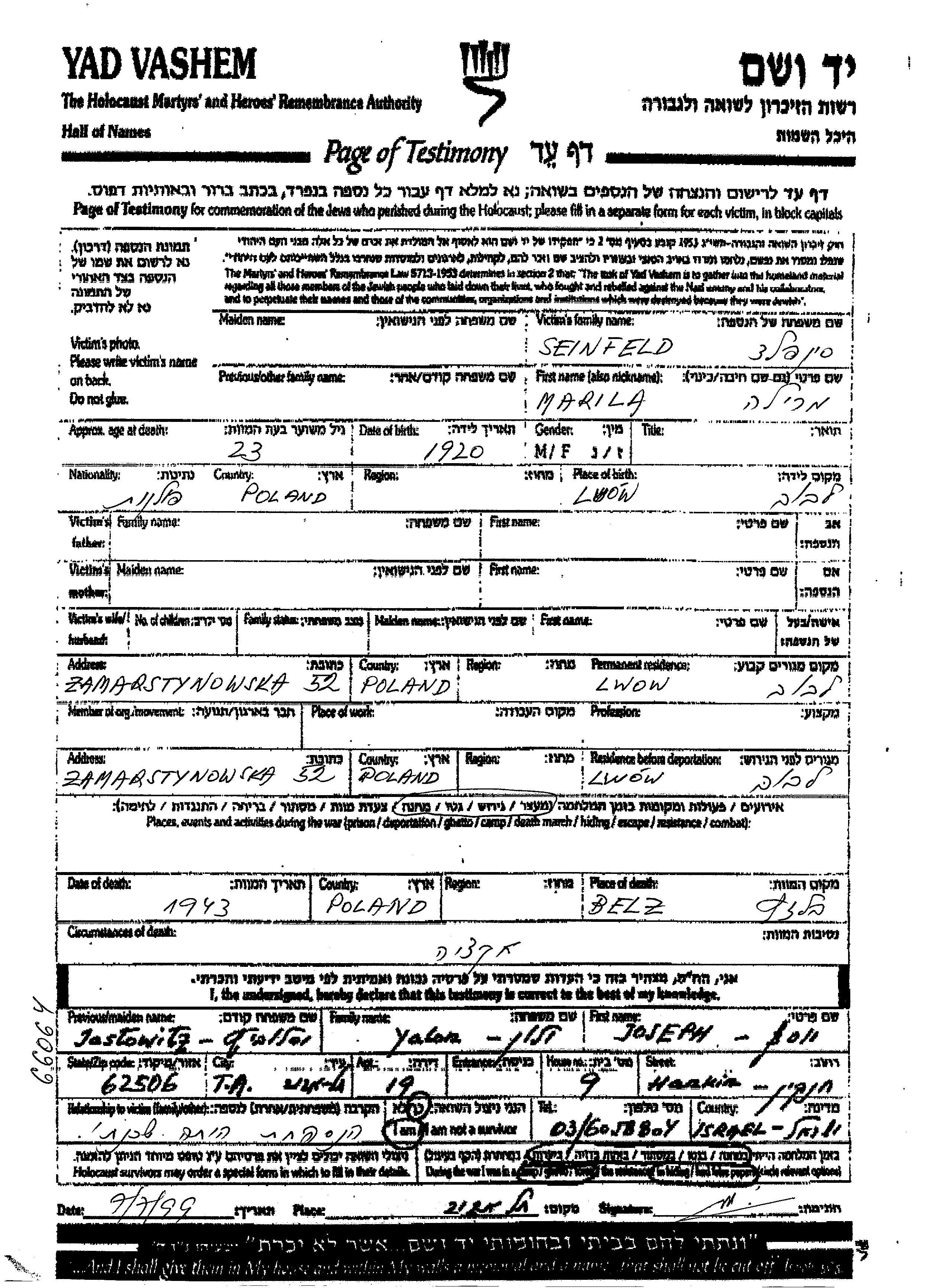Marila Sheinfeld wurde im Jahr 1920 in Lwow, Polen geboren. Vor dem Zweiten Weltkrieg lebte sie in Lwow, Polen. Während des Krieges war sie in Lwow, Polen.