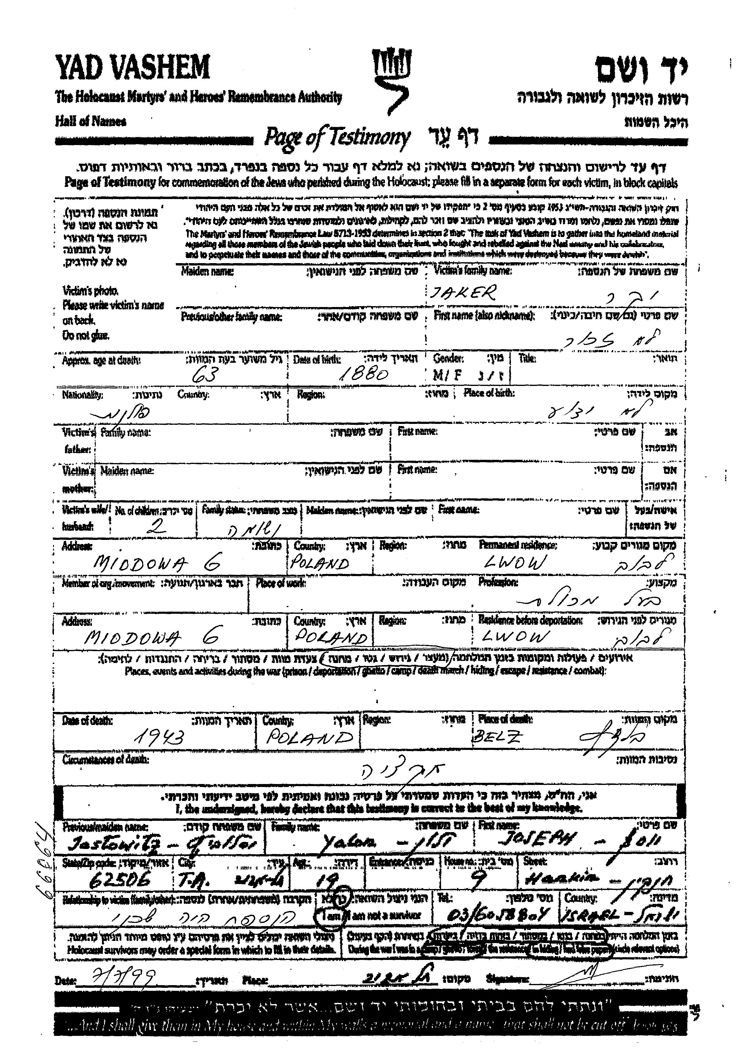 Vorname unbekannt Jaker Iakar wurde im Jahr 1880 geboren. Er war Besitzer/-in eines lebensmittelgeschäfts und Verheiratet. Vor dem Zweiten Weltkrieg lebte er in Lwow, Polen. Während des Krieges war er in Lwow, Polen.