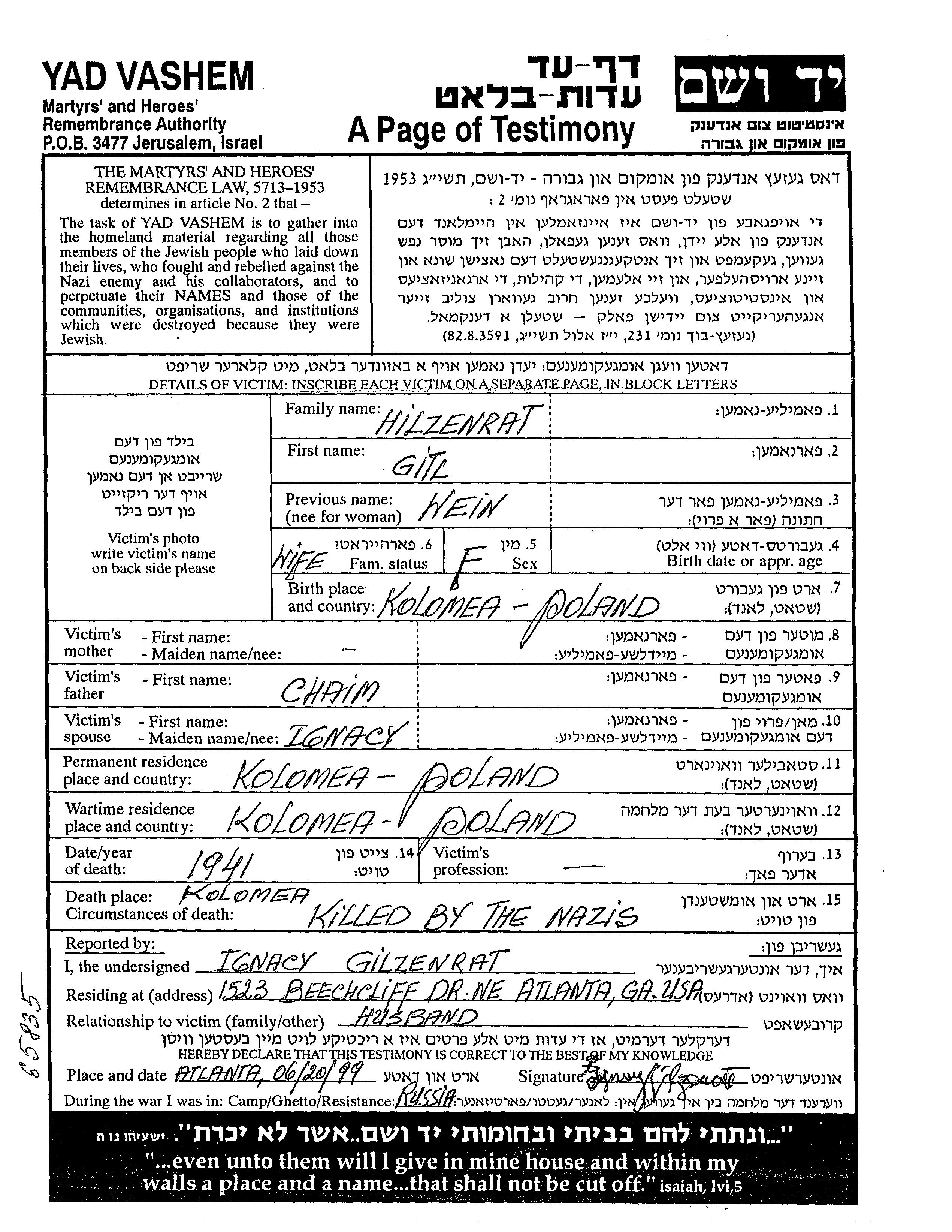 Gitl Hilzenrat wurde in Kolomea, Polen geboren. Sie war die Tochter von Chaim. Sie war mit Ignacy Verheiratet. Vor dem Zweiten Weltkrieg lebte sie in Kolomea, Polen. Während des Krieges war sie in Kolomea, Polen.