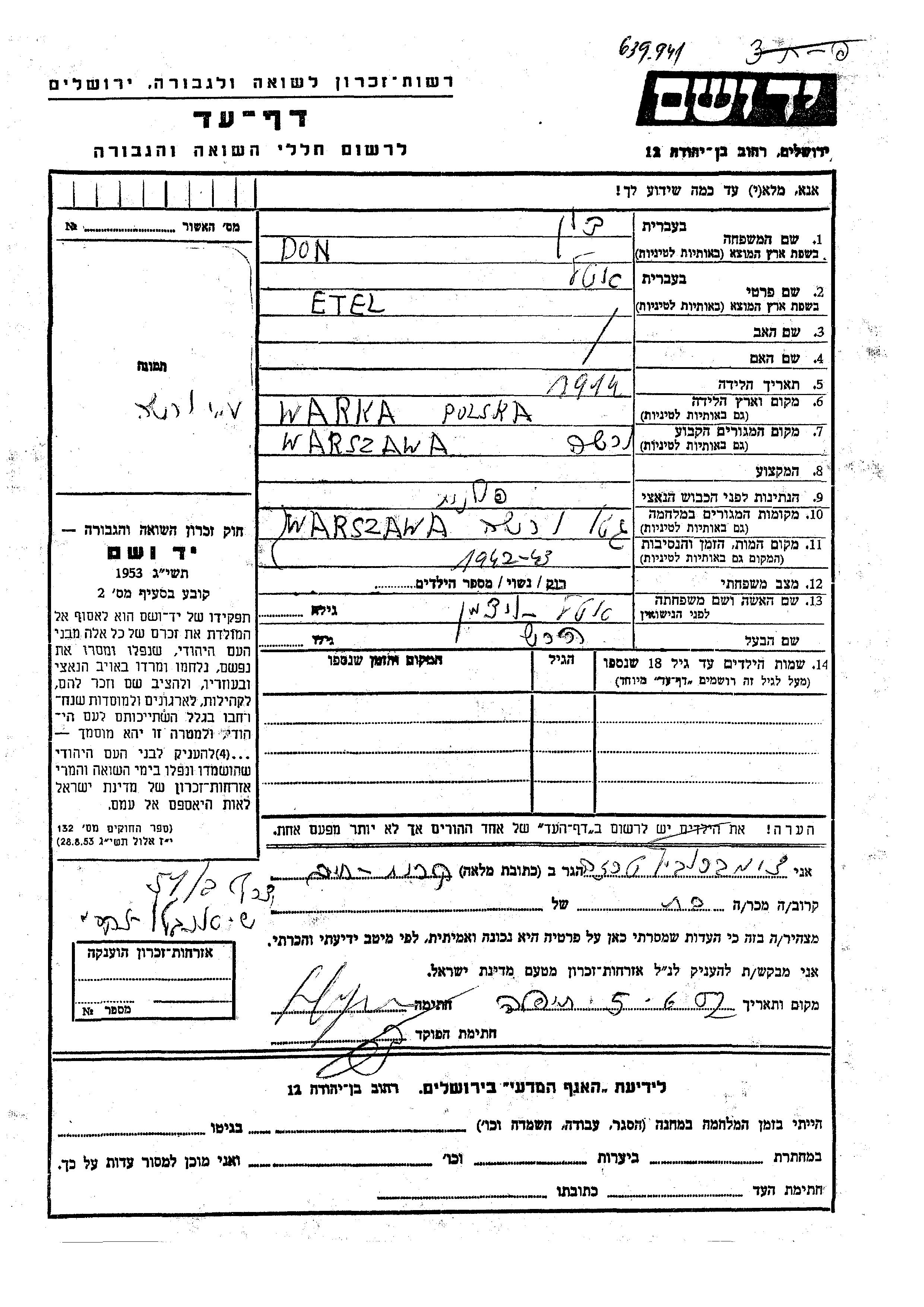 Etel Don, geb. Veitzman wurde im Jahr 1914 in Warsaw, Polen geboren. Sie war mit Hersh Verheiratet. Vor dem Zweiten Weltkrieg lebte sie in Warsaw, Polen. Während des Krieges war sie in Warsaw, Polen.