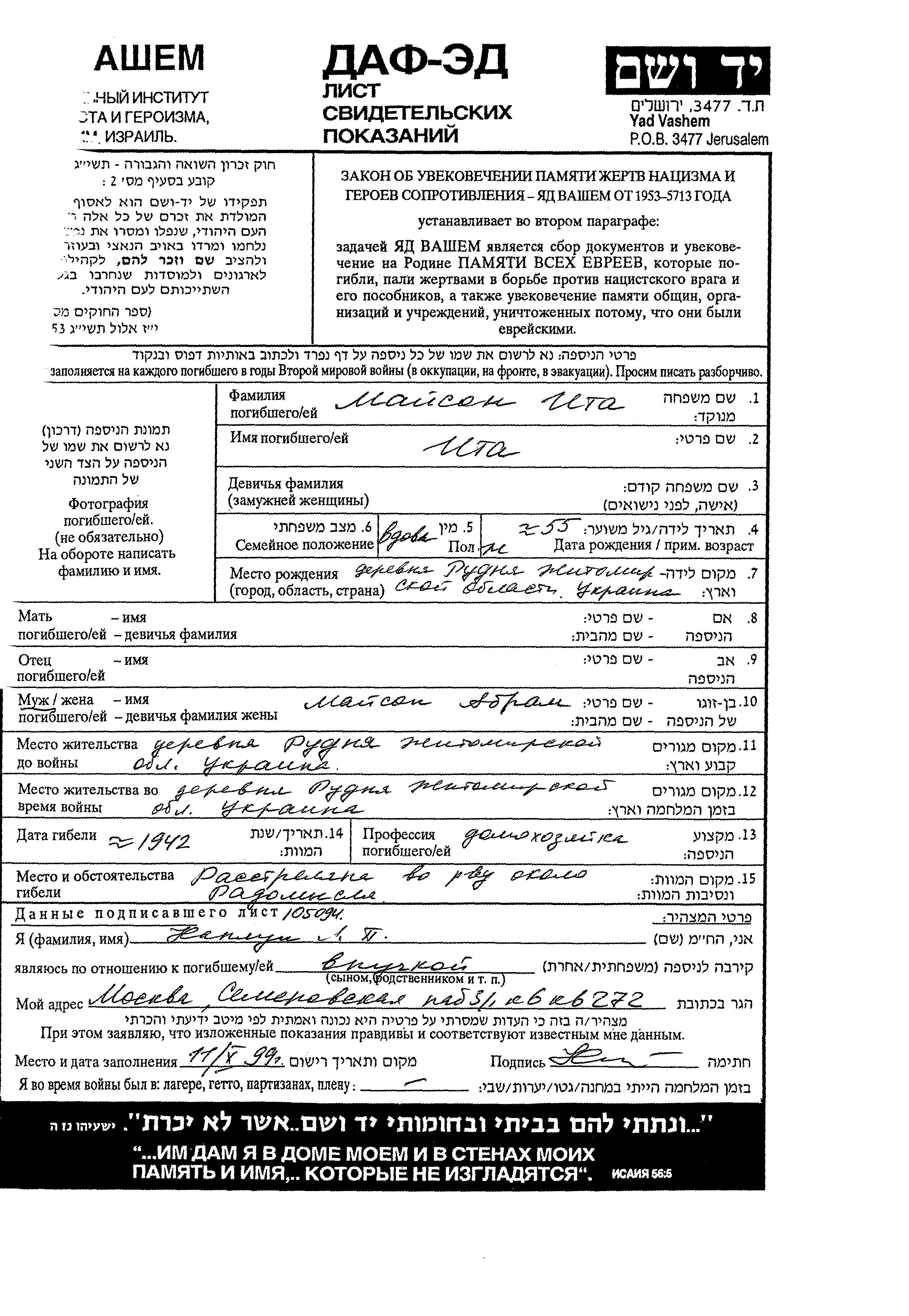 Ita Maison wurde in Rudnya, Ukraine (UdSSR) geboren. Sie war Hausfrau und mit Abram Witwe. Vor dem Zweiten Weltkrieg lebte sie in Zaporozhye, Ukraine (UdSSR). Während des Krieges war sie in Zaporozhye, Ukraine (UdSSR).