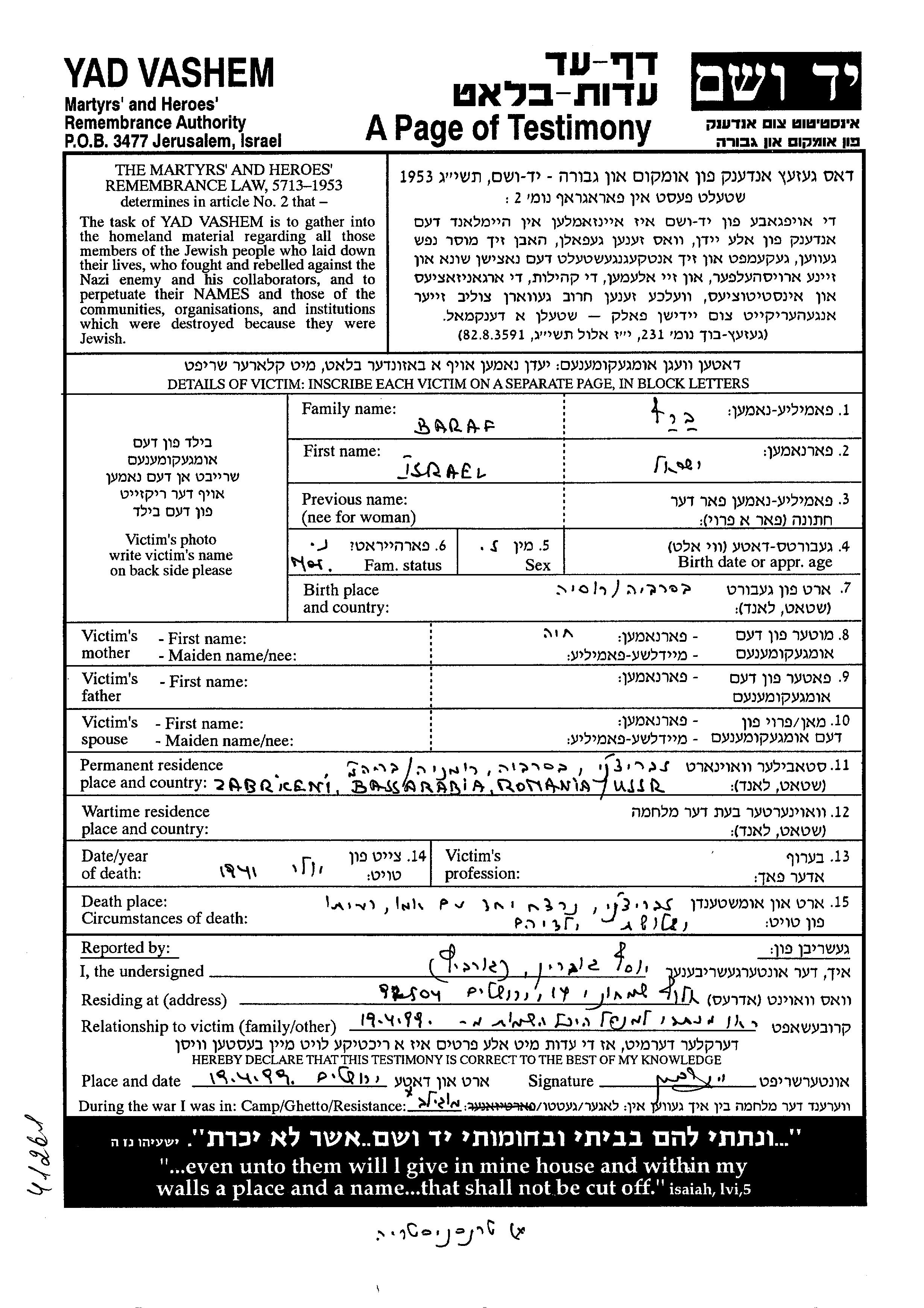 Israel Baraf wurde in Bessarabia, Rumänien geboren. Er war der Sohn von Khaia. Er war Verheiratet. Vor dem Zweiten Weltkrieg lebte er in Zabriceni, Rumänien.