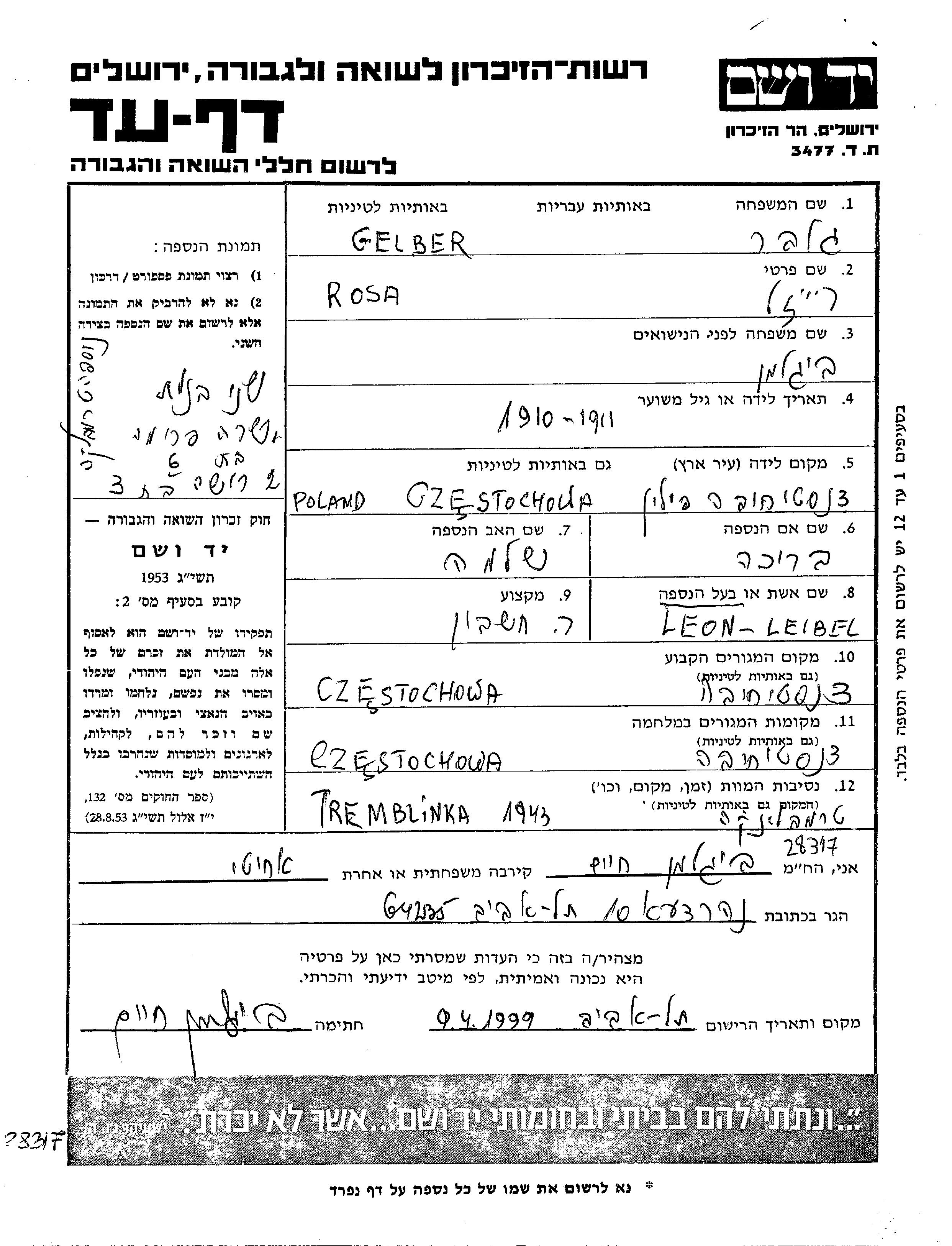 Rosa Gelber wurde im Jahr 1910 in Czestochowa, Polen geboren. Sie war die Tochter von Shlomo und Brakha. Sie war Wirtschaftsprüfer/-in und mit Leon Leibel Verheiratet. Vor dem Zweiten Weltkrieg lebte sie in Czestochowa, Polen. Während des Krieges war sie in Czestochowa, Polen.