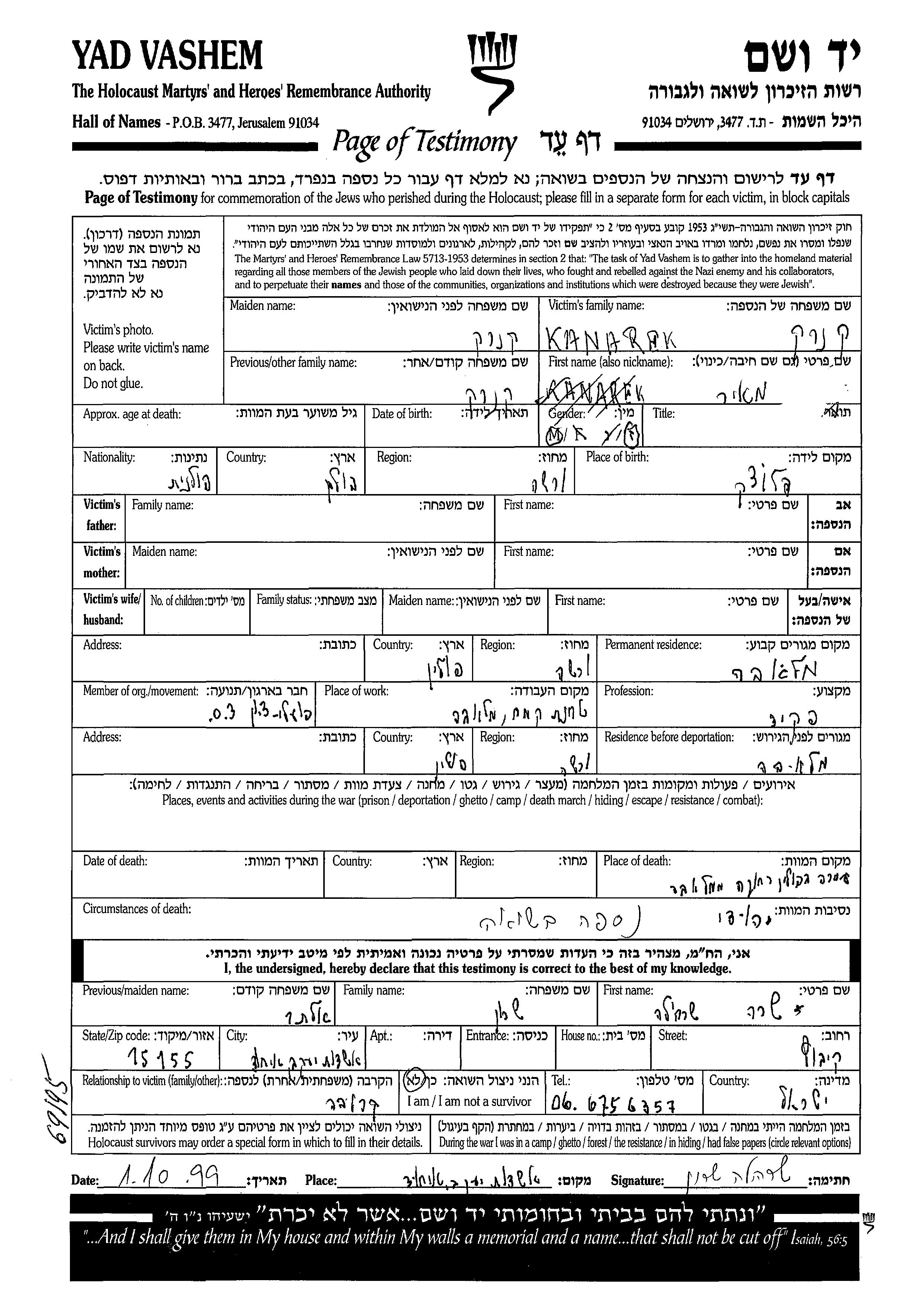 Meir Kanarek wurde in Plock, Polen geboren. Er war Angestellte/-r. Vor dem Zweiten Weltkrieg lebte er in Mlava, Polen. Während des Krieges war er in Mlava, Polen.